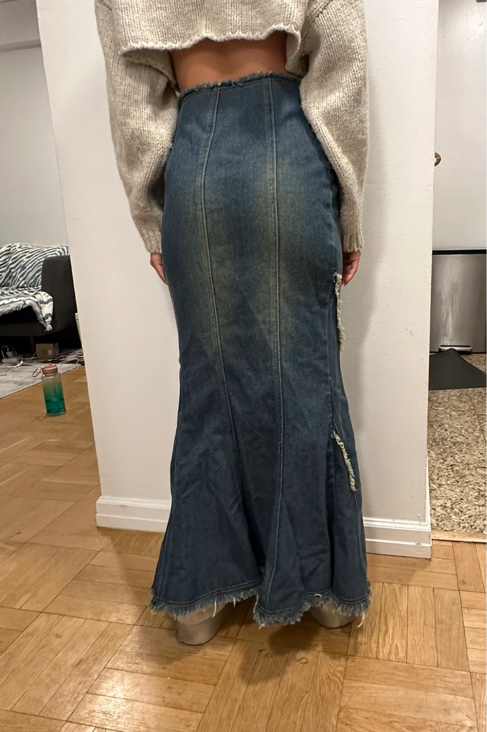 Selling a denim mermaid maxi skirt from Cider. It's a unique piece with a distinctive design, featuring distressed detailing and a flattering silhouette. Perfect for adding a touch of edgy style to your wardrobe!
