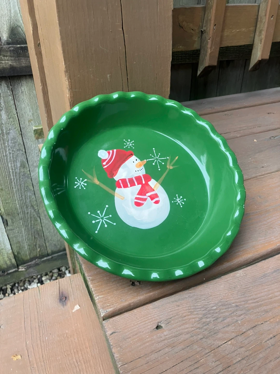 Hand Painted Snowman 9” Stoneware Deep Dish Pie Plate - Excellent Condition