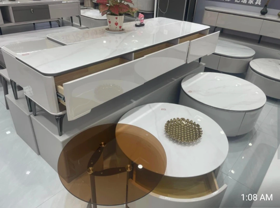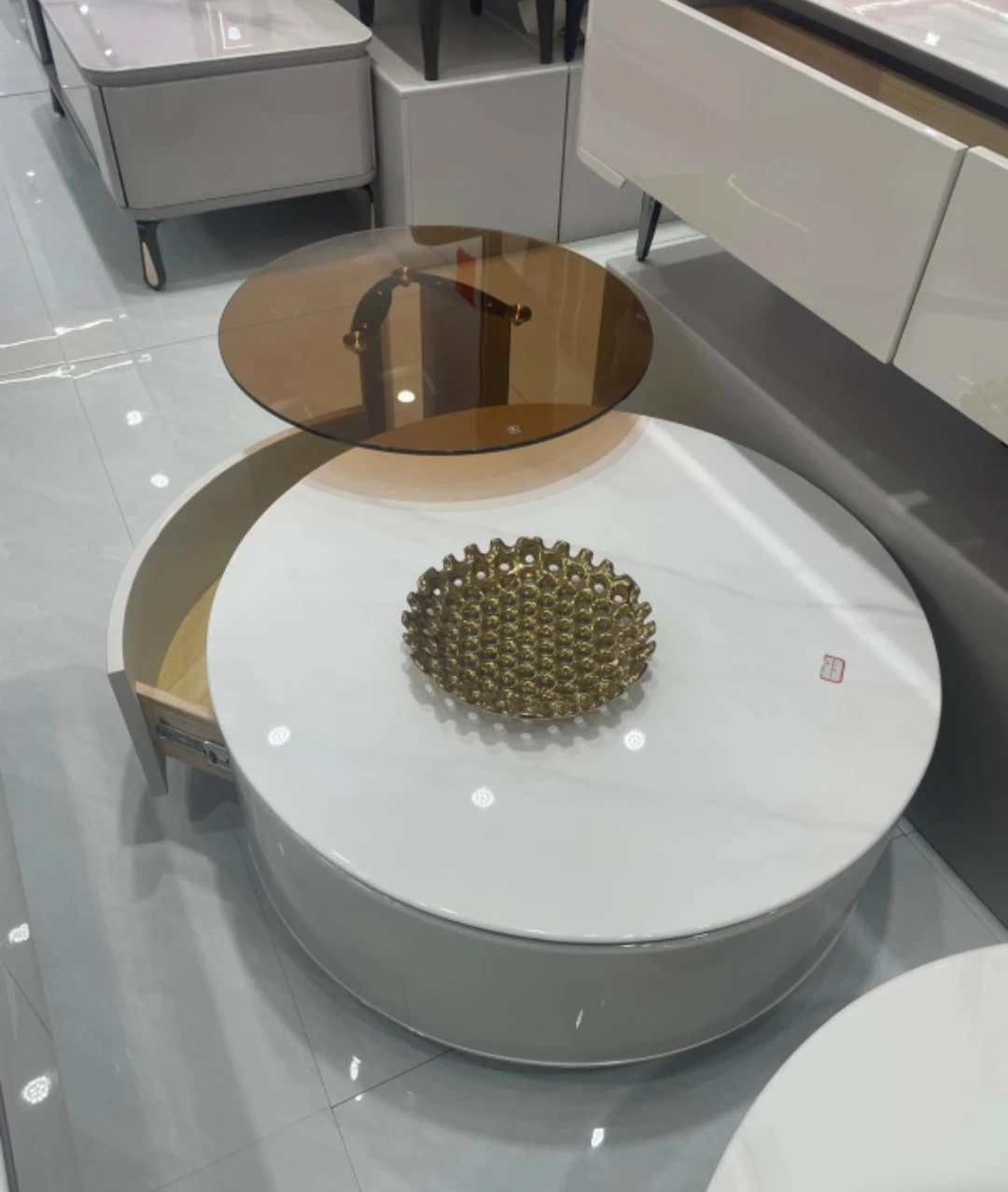 Selling a stylish round coffee table! It features a sleek design with a white base and a beautiful glass top. It also has a drawer for storage
