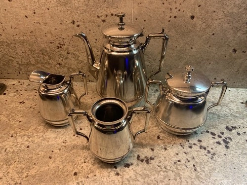 This antique tea set from Rogers Smith & Co. is a beautiful addition to any collection. Its Victorian styling makes it a unique set. Rogers Smith & Co. was located in Meriden Ct. between 1877 and 1904, which means this set is between 119 and 146 years old. It has been well-preserved and is in excellent condition. The set includes a teapot, creamer, sugar bowl and waste bowl. All are elegantly designed, with interesting detail at the handles and finials to the teapot and sugar bowl which look Machine age.