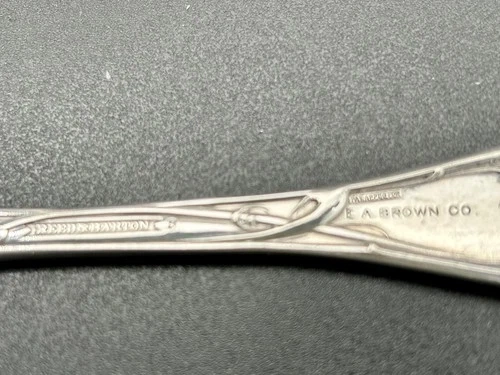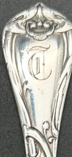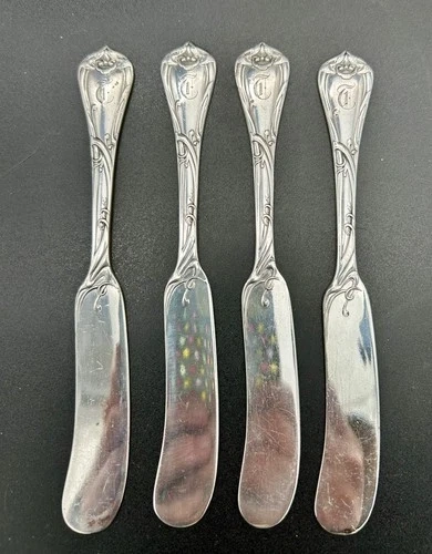 Set of four Reed and Barton Modern Art pattern butter spreaders with "T" monogram. These silver plated butter knives are in the Art Nouveau style. Produced in the United States in 1904, they are a unique and elegant addition to any antique flatware collection.
