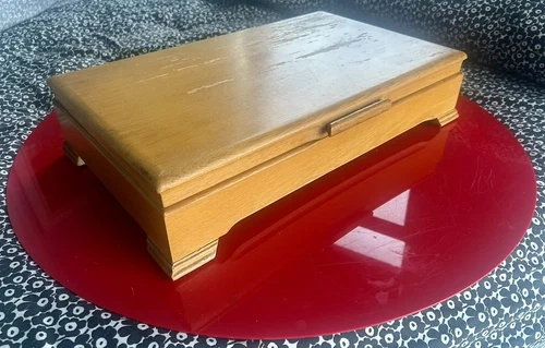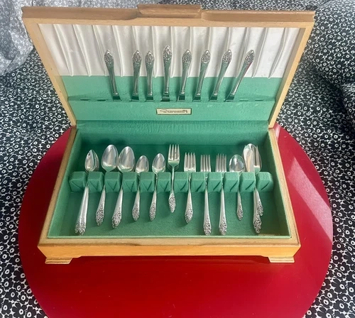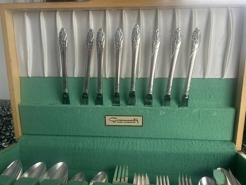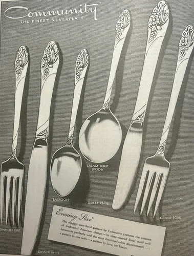 This elegant 6-piece setting from Community Oneida is the perfect addition to any dinner party. Crafted in high-quality silverplate and adorned with the beautiful Evening Star pattern, this set will impress. The set includes everything you need to serve 6 people, including a grille fork, salad fork, grille knife, place spoon, iced tea spoon and teaspoon. The set also includes a serving spoon, cold meat fork, sugar spoon, and master butter knife plus a tarnish-proof wooden box for storage and display. The set is in very good estate condition with only minor scratching. Community/ Oneida first introduced this pattern in 1950 and it was discontinued in 1961, everything looks great considering it's over 60 years old!