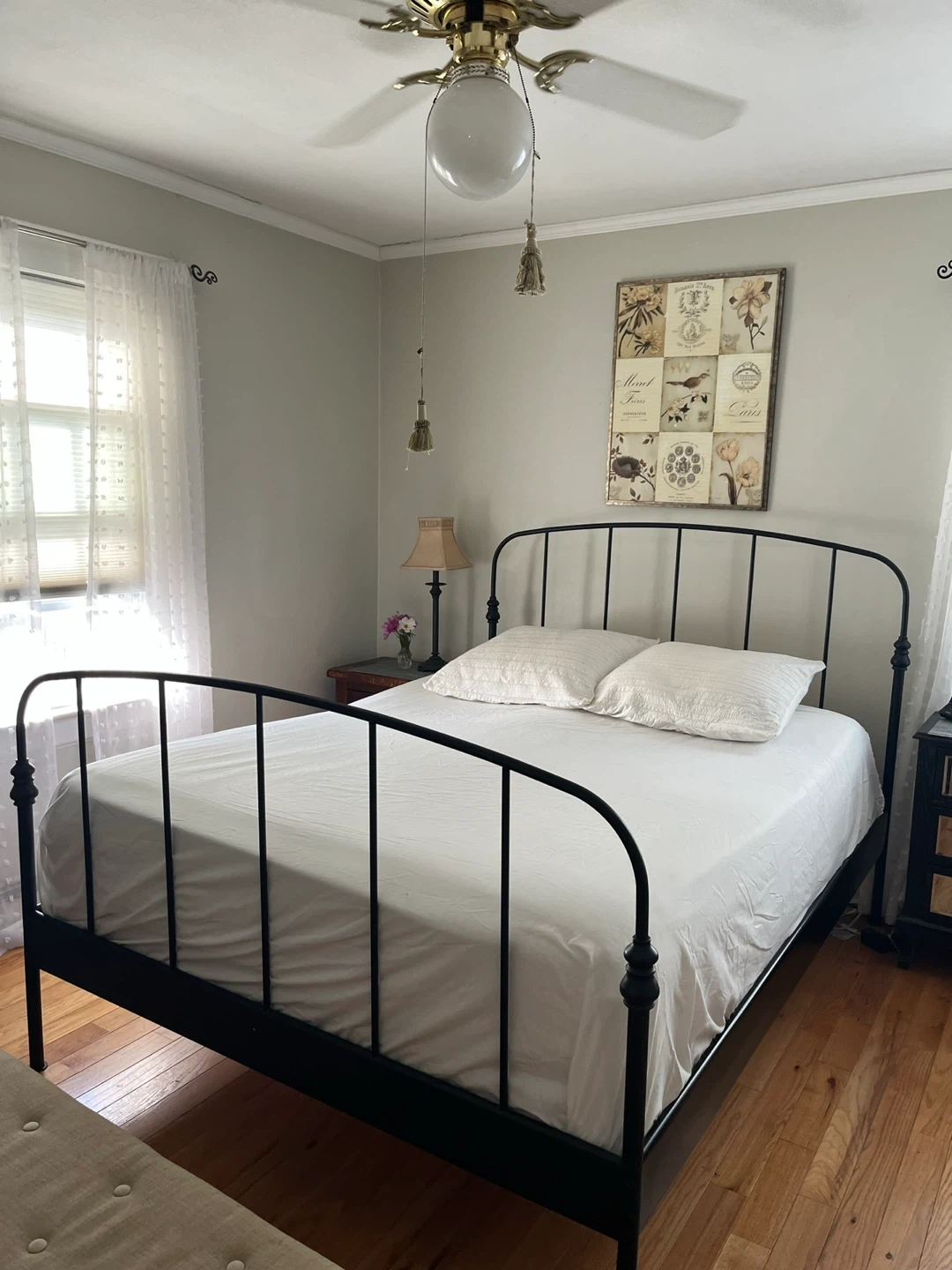 Selling a sturdy black metal bed frame, perfect for a queen size mattress. It's in great condition and ready to add a touch of elegance to your bedroom. The simple yet stylish design complements any decor.