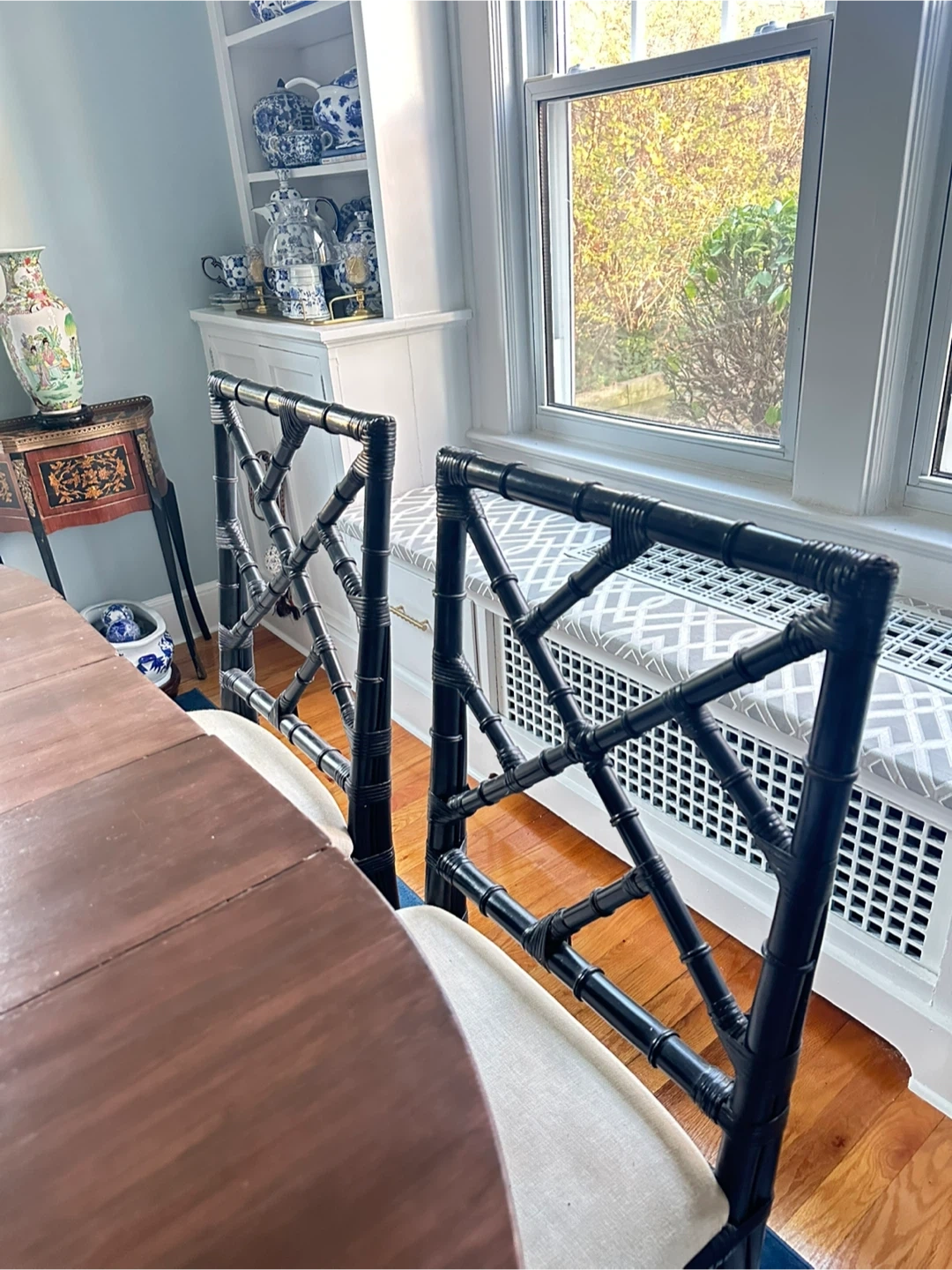 Selling a dining table with four bamboo-style chairs. The table has a dark wood top and a distressed white base. The chairs are black with a light-colored seat cushion. Perfect for a dining room or kitchen!