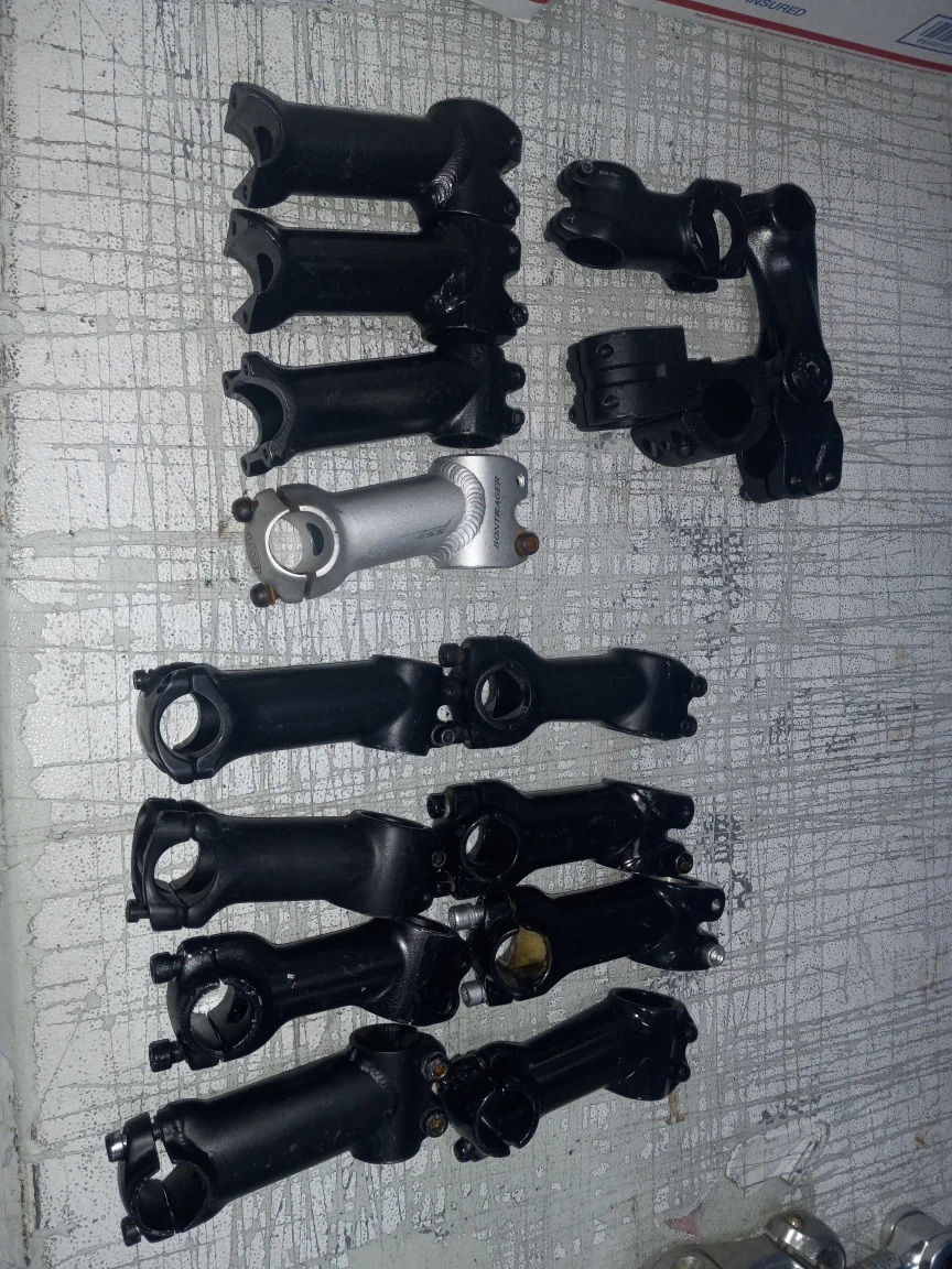 Selling a lot of bike stems! There are several black stems and one silver Bontrager stem. Great for bike enthusiasts or repair shops. I am asking $10 a set or $6 in bulk.