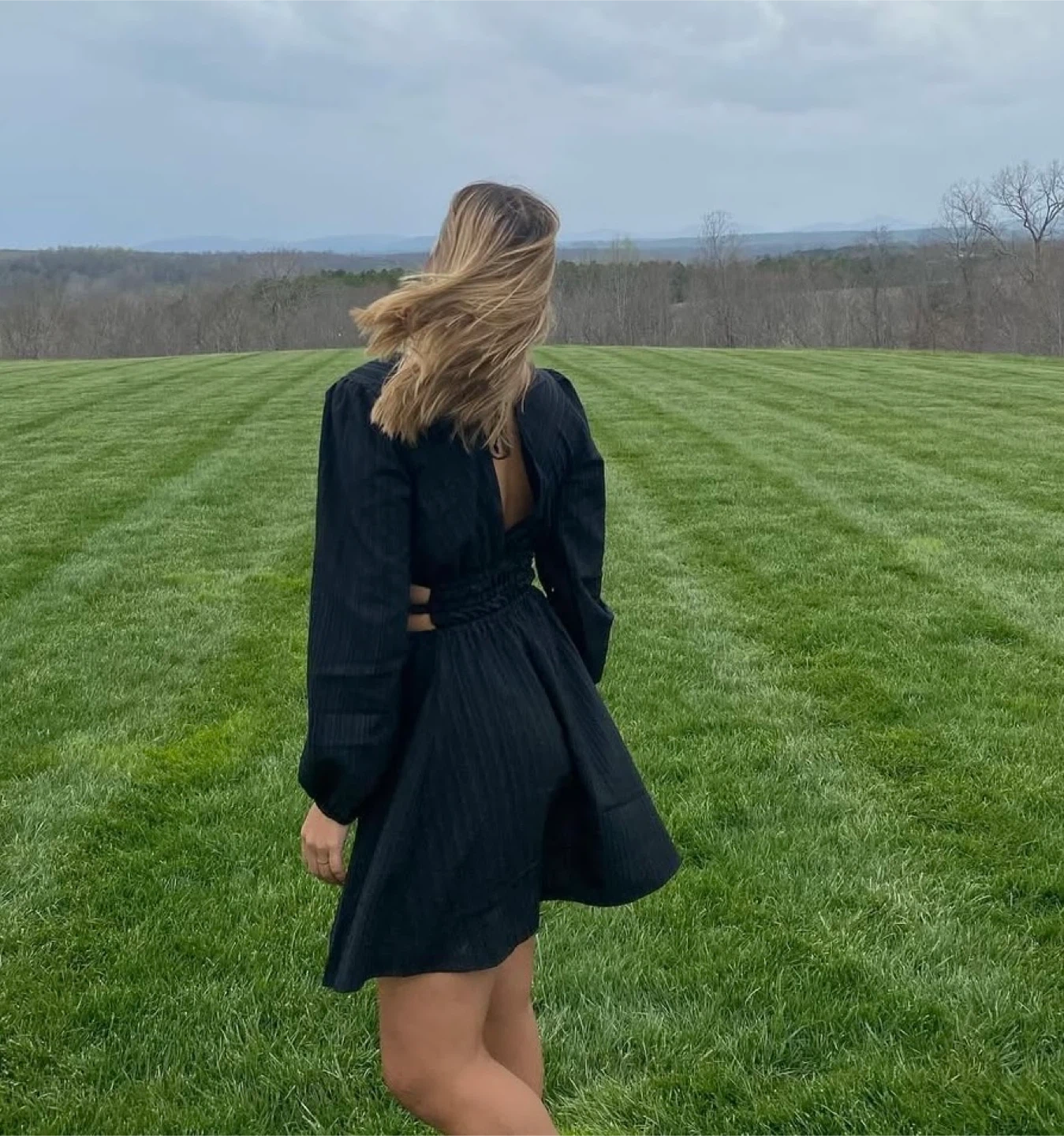 A cute black mini dress! It features a flattering V-neck and long sleeves, perfect for a night out or a special occasion. The dress has a stylish cutout design at the waist, adding a touch of elegance to the overall look