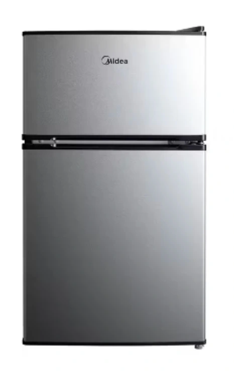 Selling a Midea compact refrigerator. It features a separate 0.9 cubic feet freezer compartment, a fruit and vegetable drawer with clear view and interior light, and an interior beverage storage system. The shelves are adjustable and removable glass, and the door is reversible with right or left opening. It also has adjustable legs for leveling on irregular surfaces