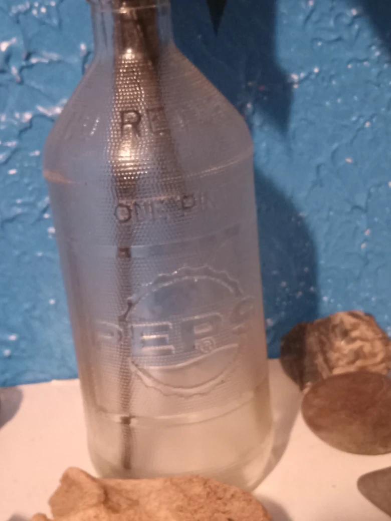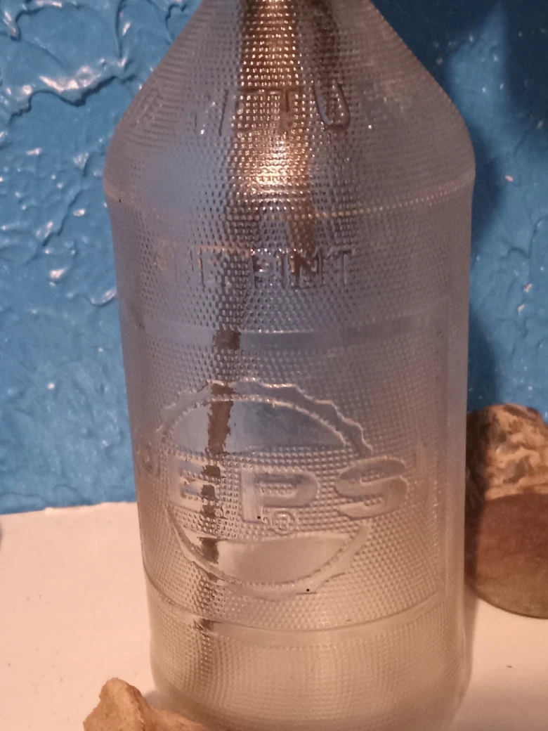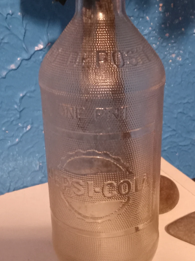 Selling a vintage Pepsi-Cola bottle! It's a one-pint size and has the classic Pepsi logo embossed on the glass. A cool piece of history for any collector!