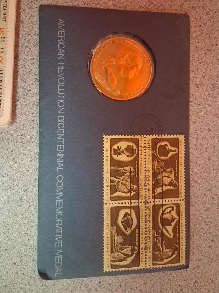 Offering an American Revolution Bicentennial Commemorative Medal. It comes in its original packaging, which includes commemorative stamps and information about the Boston Tea Party. A great piece of history!