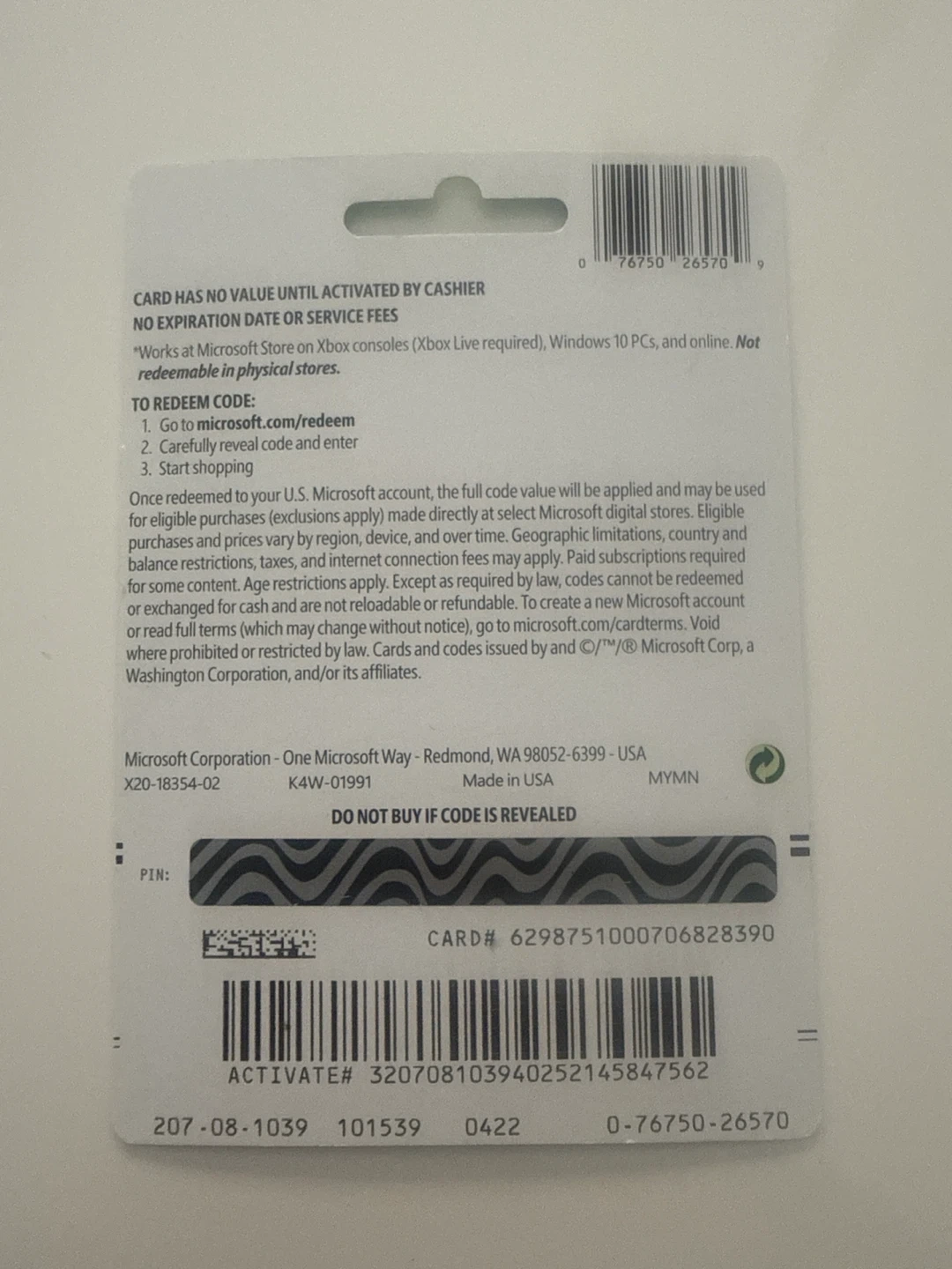 I have a Microsoft gift card available. K has no expiration date or service fees. It works at the Microsoft Store on Xbox consoles, Windows 10 PCs, and online, but it's not redeemable in physical stores. Feel free to reach out if you're interested!
