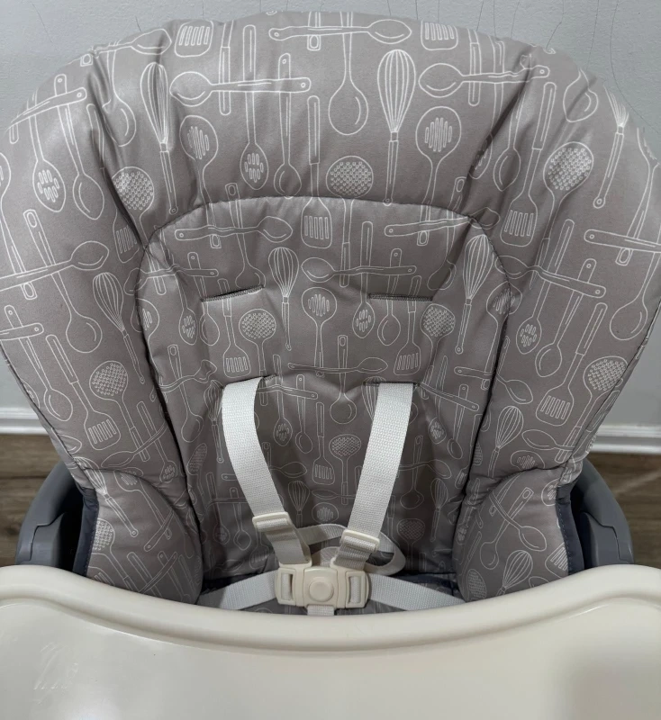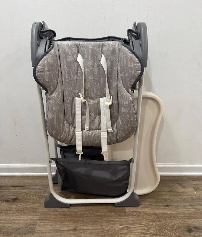 Selling a Graco Slim Snacker foldable high chair in great condition! It features a gray color scheme with a cute utensil pattern on the seat pad. This high chair is perfect for saving space and easy storage. It also has a convenient storage basket underneath