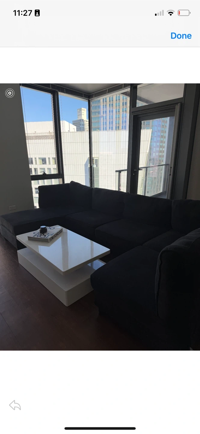 Selling a comfortable black sectional sofa. It's a great piece to add to your living room, offering ample seating space for family and friends. The material feels soft and inviting, perfect for lounging after a long day. It's in good condition and ready for a new home!