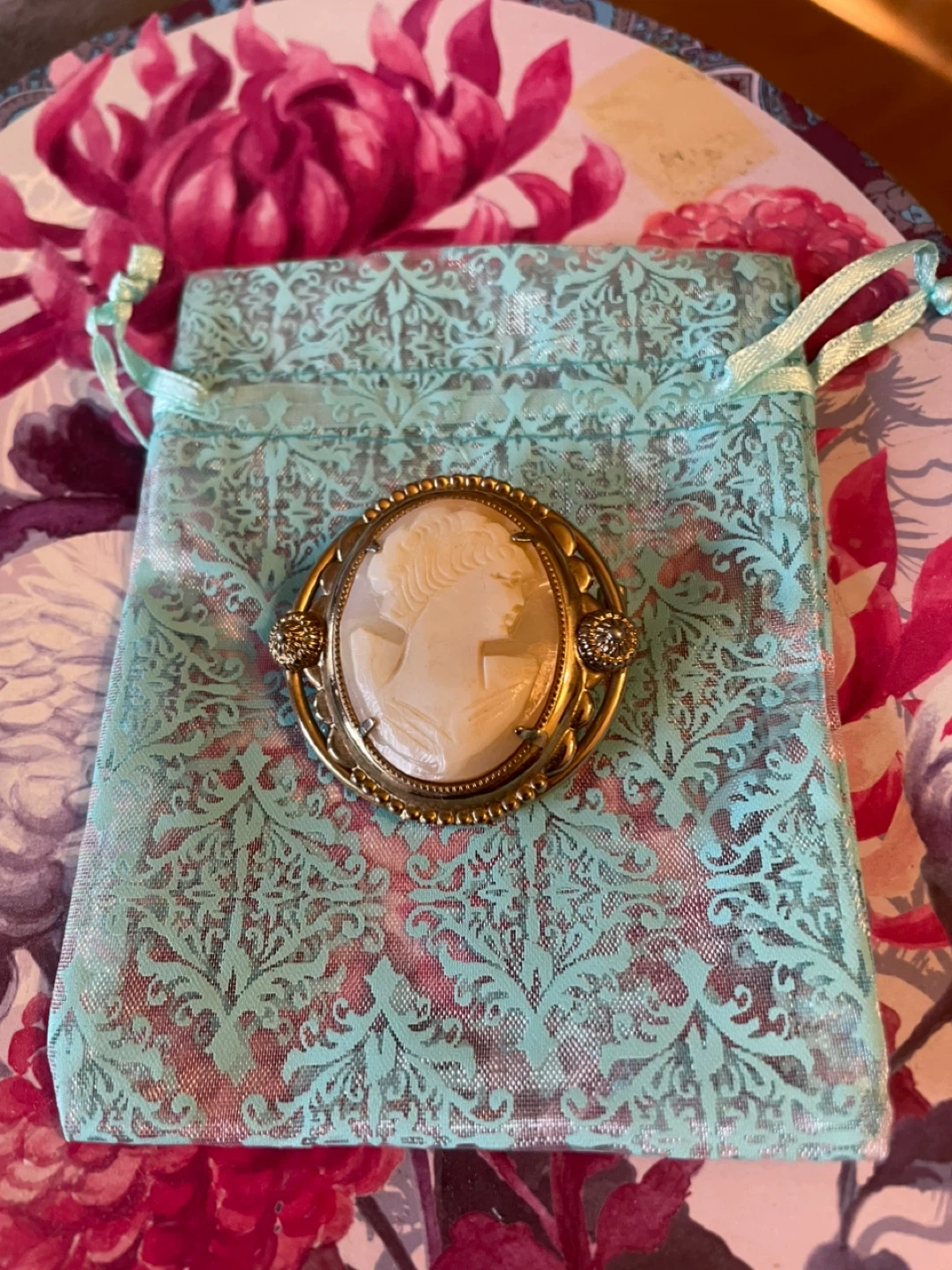 Here's a lovely vintage cameo brooch! It features a classic design with a lady's profile. The brooch has a gold-tone frame and is in great condition. It comes with a pretty blue drawstring pouch for safekeeping