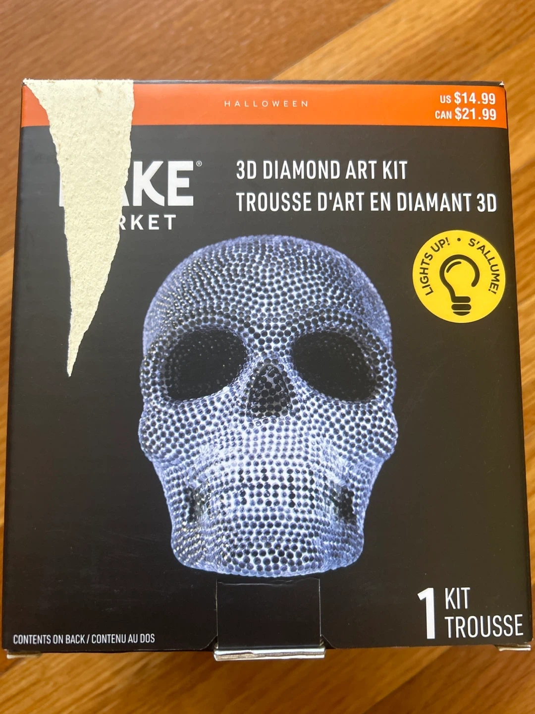 Selling a brand new Make Market 3D Diamond Art Kit. This kit contains a pre-printed plastic skull with LED lights, pre-sorted diamond art gems in two colors, glue, an application brush, stylus, stylus grip cover, craft tray, wax caddy, and an instruction sheet. The skull measures approximately 5.9 in x 4.4 in x 3.6 in (15 cm x 11.2 cm x 9.2 cm). Originally retailed for $14.99 USD.