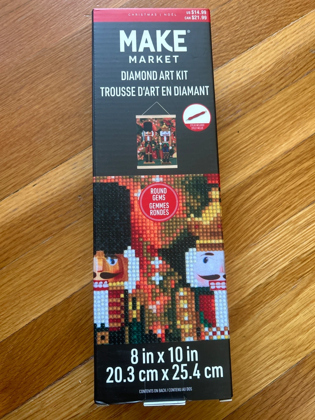 I'm selling a brand new Make Market Diamond Art Kit featuring a Nutcrackers design! The kit includes pre-sorted diamond art gems, a magnetic wooden frame, a craft tray, a stylus, and an instruction sheet. The finished project size is 8 in x 10 in (20.3 cm x 25.4 cm).