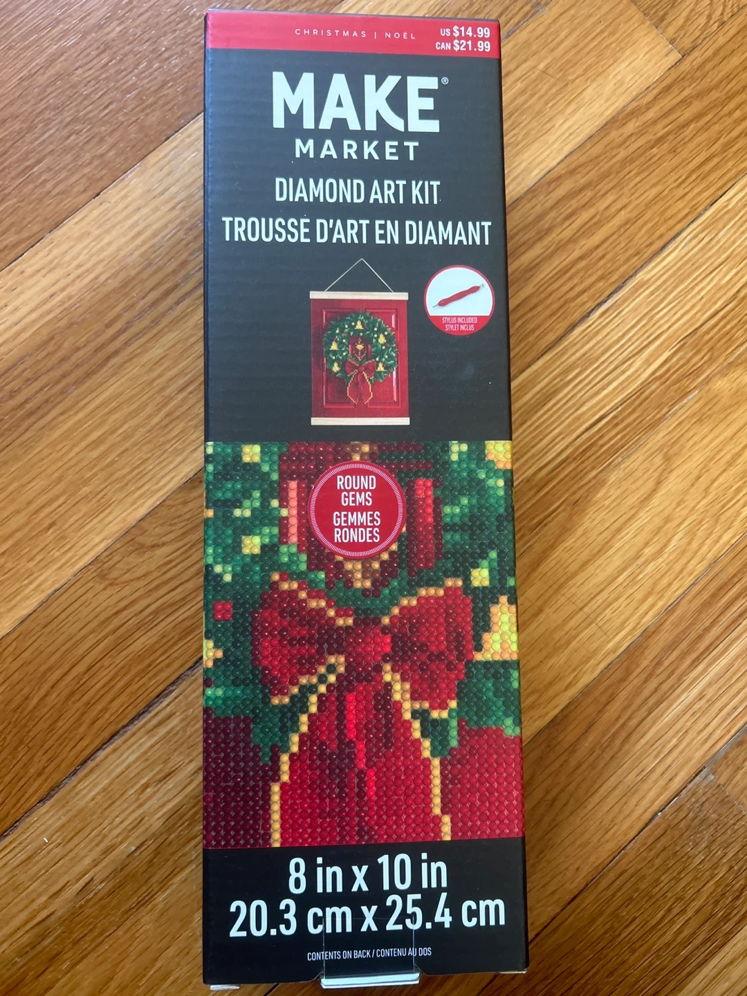 I'm selling a brand new Make Market Diamond Art Kit featuring a wreath design! The kit includes a pre-printed canvas (100% polyester), pre-sorted diamond art gems (24 colors), a magnetic wooden frame, resin stylus with 2 nibs,craft tray, wax caddy and an instruction sheet. The finished artwork measures 8 in x 10 in (20.3 cm x 25.4 cm). Perfect for a fun and creative project!