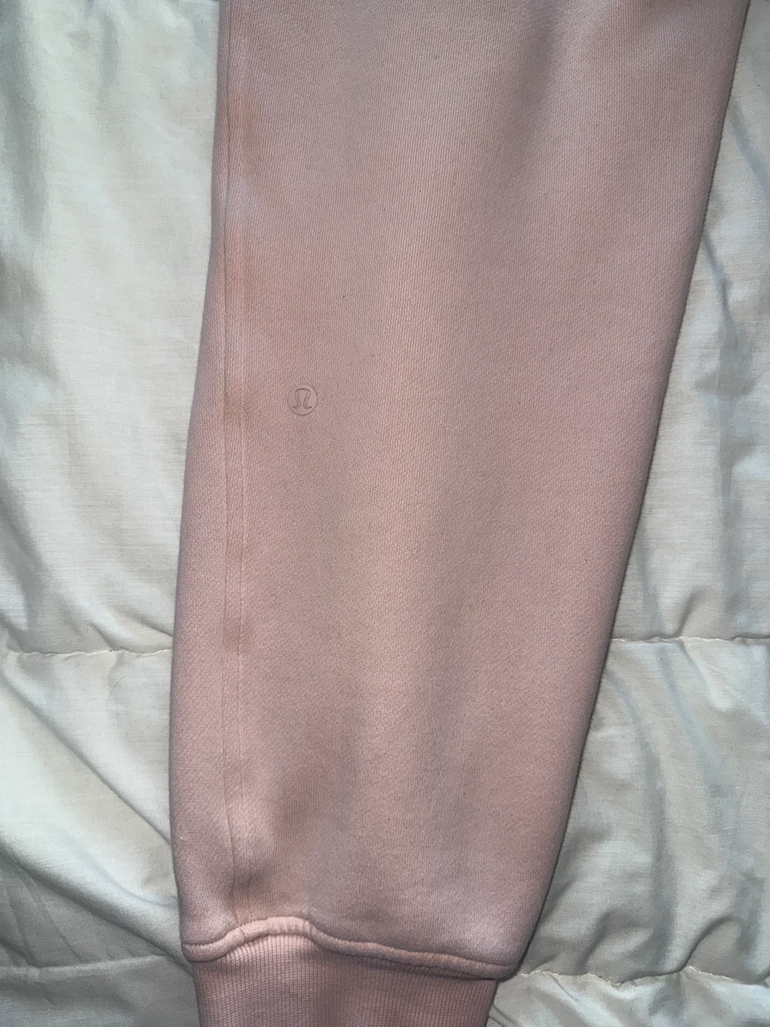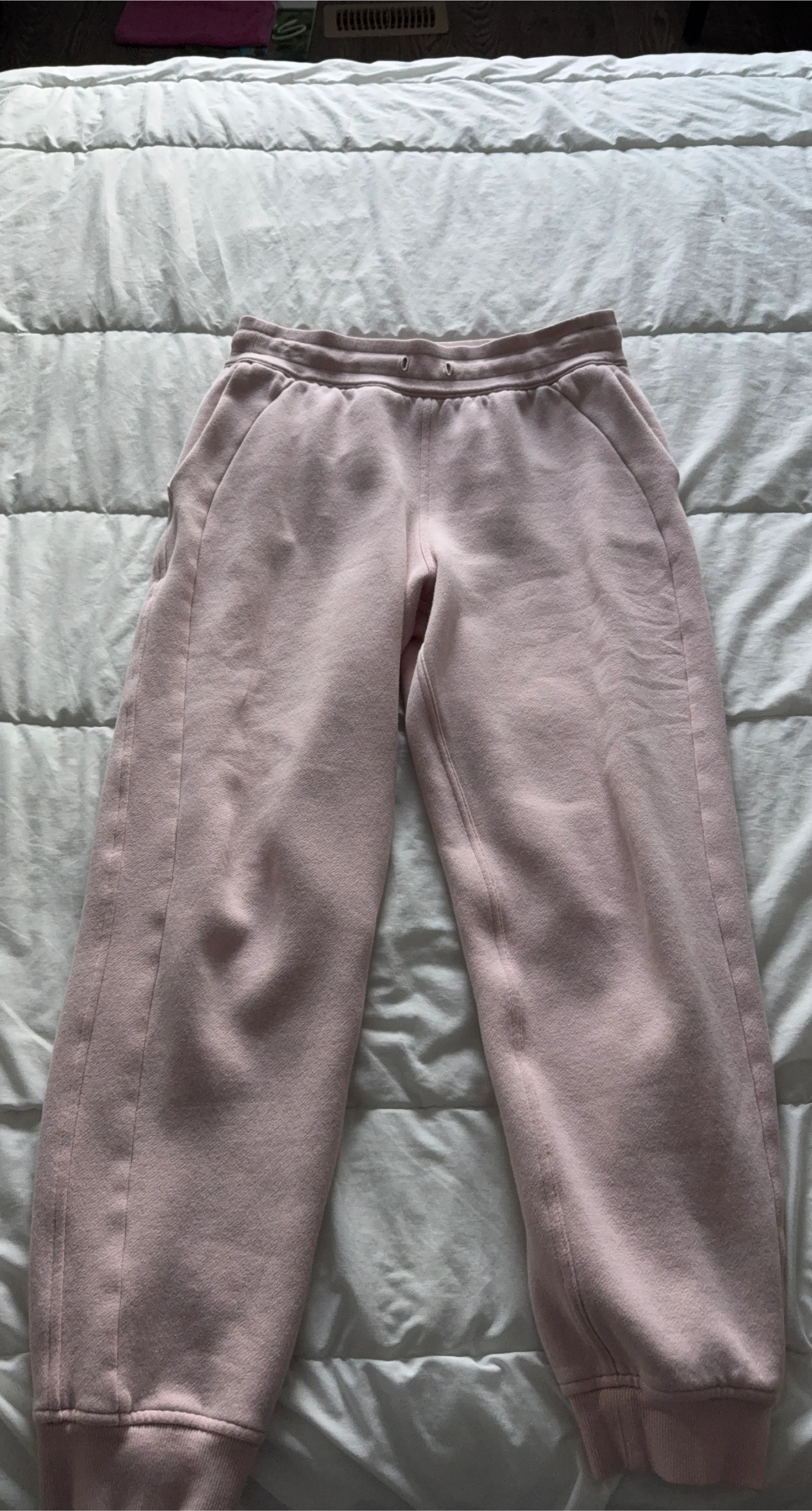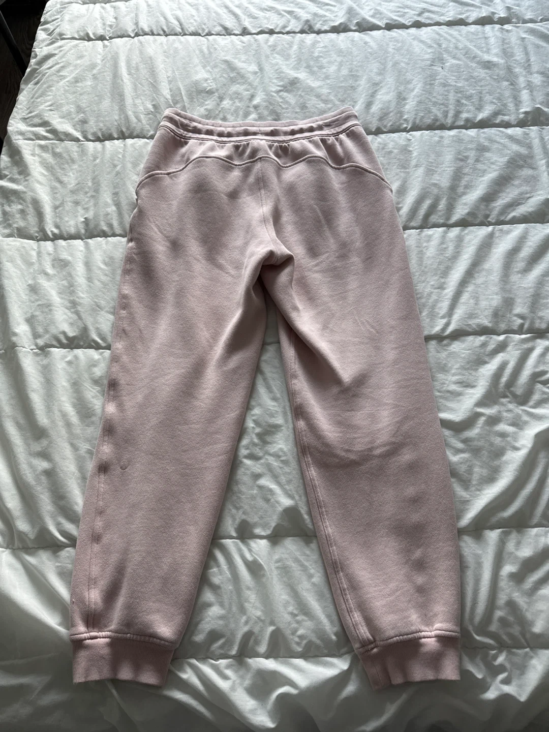 Selling a pair of Lululemon sweatpants in a lovely light pink! They're a size 8 and made with a comfy blend of 70% cotton and 30% polyester for the body, with ribbing that's 97% cotton and 3% elastane, and pockets that are 95% cotton and 5% elastane