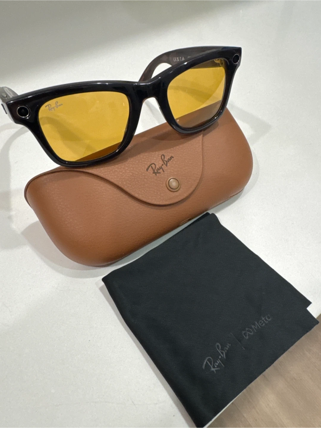 Selling a pair of Ray-Ban Meta smart glasses! They come with a case and cleaning cloth. These glasses are perfect for capturing photos and videos, listening to music, and staying connected while on the go. A stylish and tech-savvy accessory!