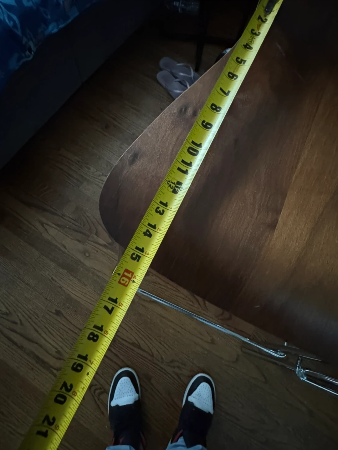 Selling a set of three bar stools! They feature a beautiful brown wood finish and a sleek, modern design. They would look great in any kitchen or bar area. The seat measures around 16-17 inches, as shown in the photos