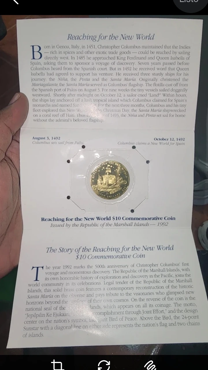 Selling a Reaching for the New World $10 Commemorative Coin issued by the Republic of the Marshall Islands in 1992. This solid brass coin commemorates the 500th anniversary of Christopher Columbus' first voyage and discovery.