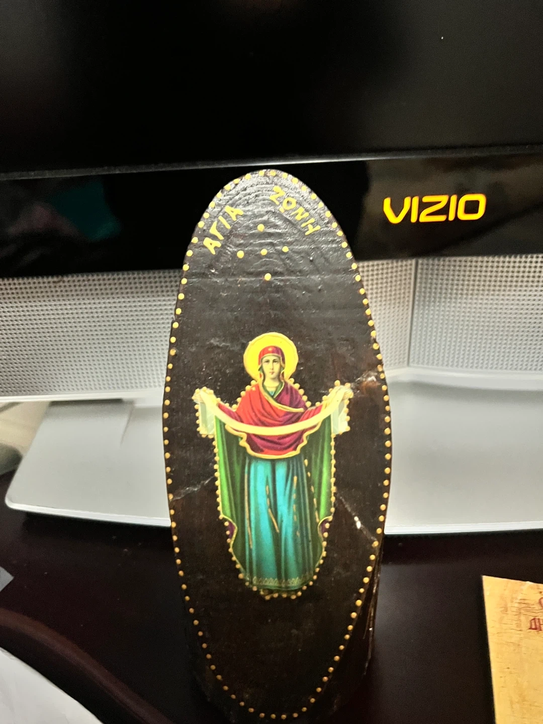 This is a religious icon, featuring an image of a saint or religious figure. It appears to be made of wood and is decorated with gold-colored accents. It would be perfect for someone interested in religious art or iconography