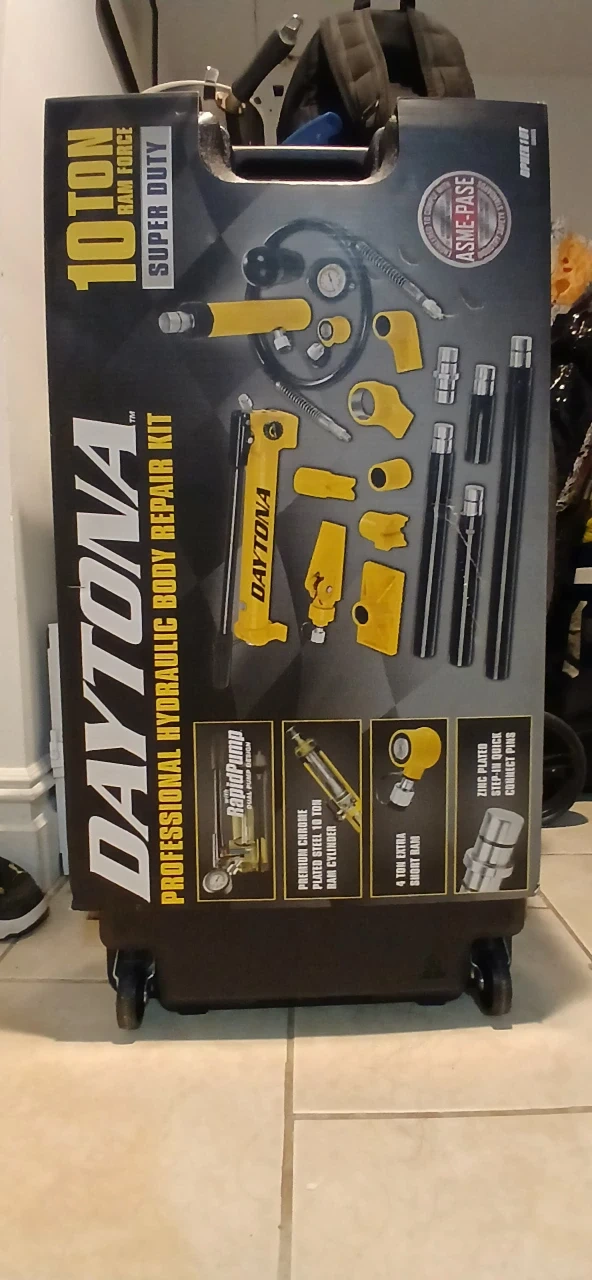 Selling a Daytona 10 Ton Professional Hydraulic Body Repair Kit. It is super duty and comes with a case. The kit includes various components such as a hydraulic pump, hose, and different attachments for body repair. It delivers a maximum pressure of 10,000 PSI and 10 TON ram force. Great for auto body work!