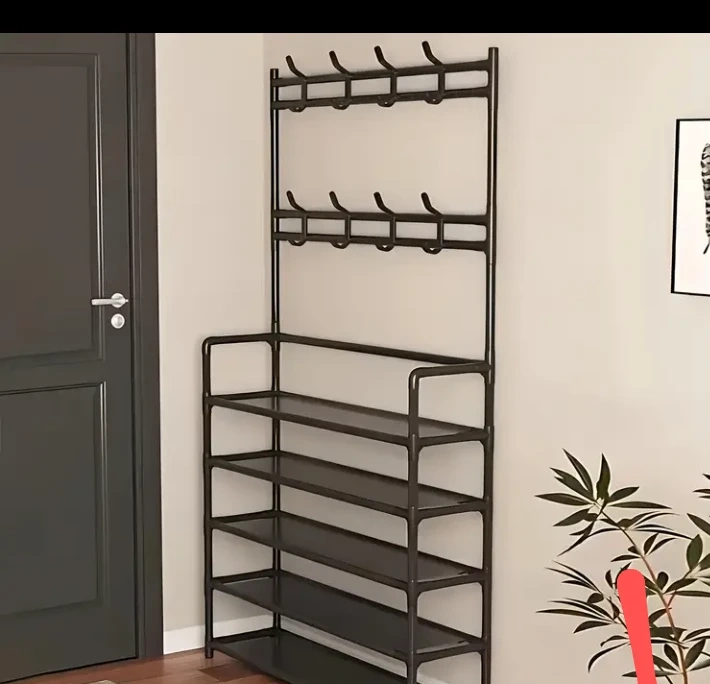 This is a shoe rack organizer with coat hooks. It features multiple shelves for shoe storage and hooks for hanging coats or other items. The rack appears to be made of metal and is in a brown color. It's a great space-saving solution for entryways or closets!