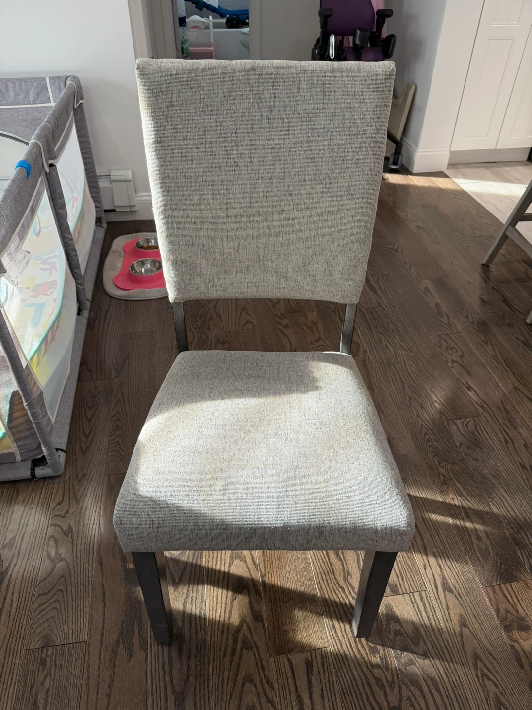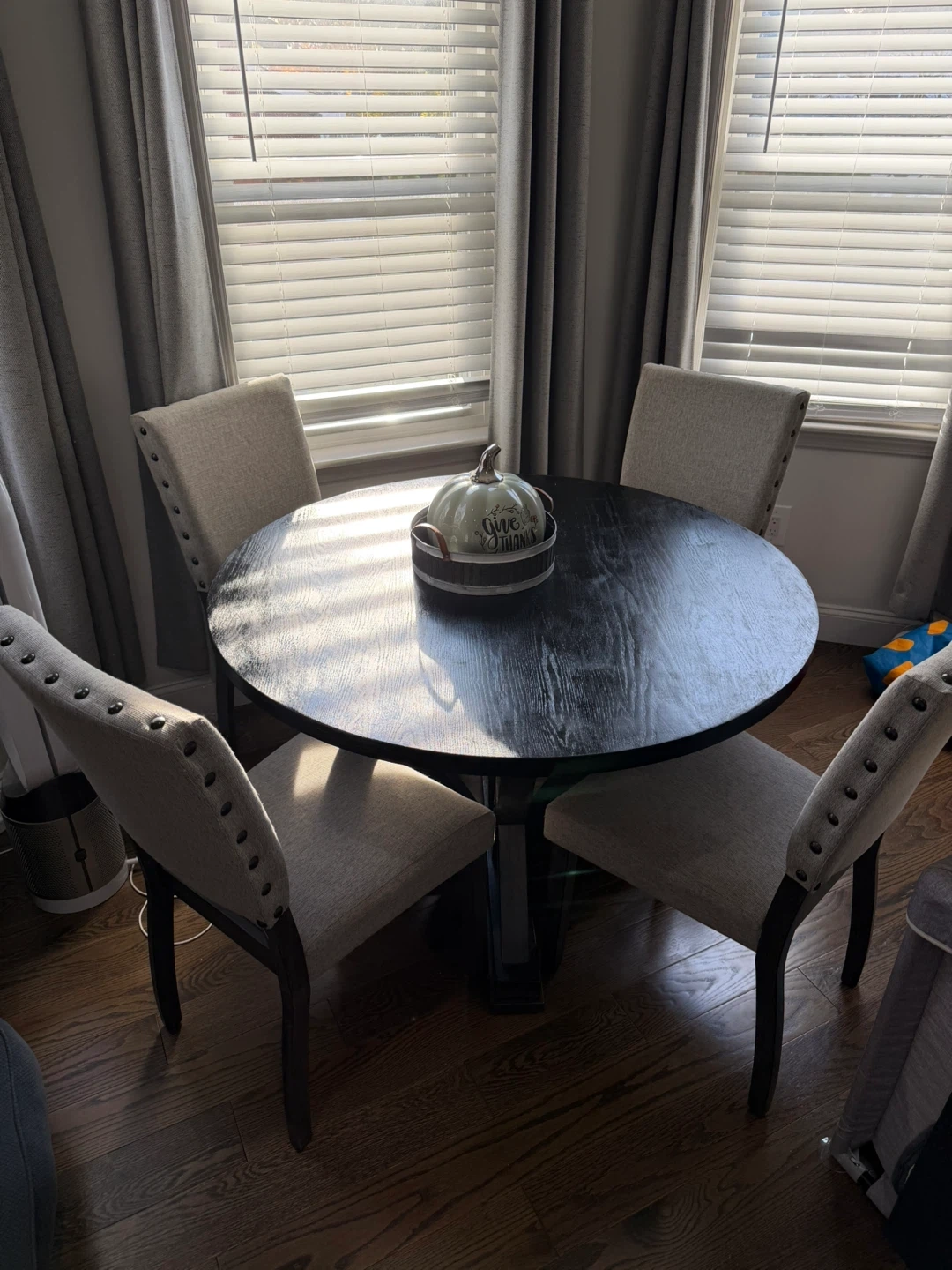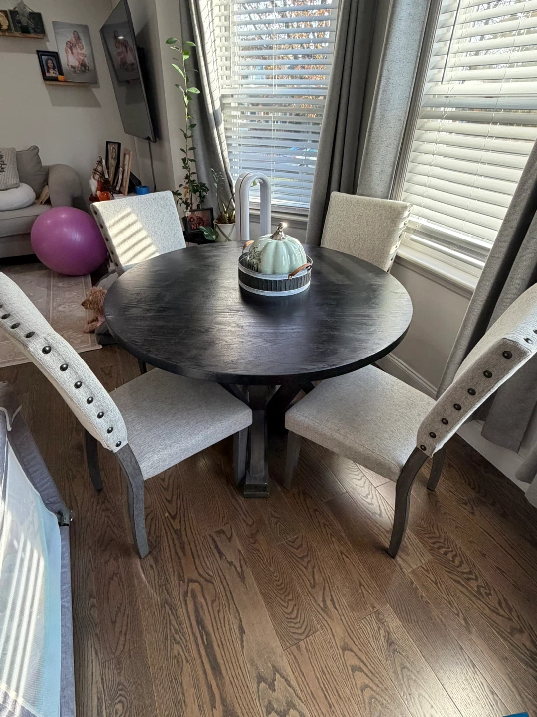 Selling a round dining table complete with four chairs. The table features a dark wood finish, and the chairs are upholstered in a neutral fabric. This set would be perfect for a smaller dining space or kitchen nook!