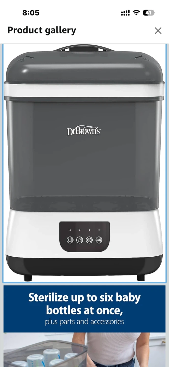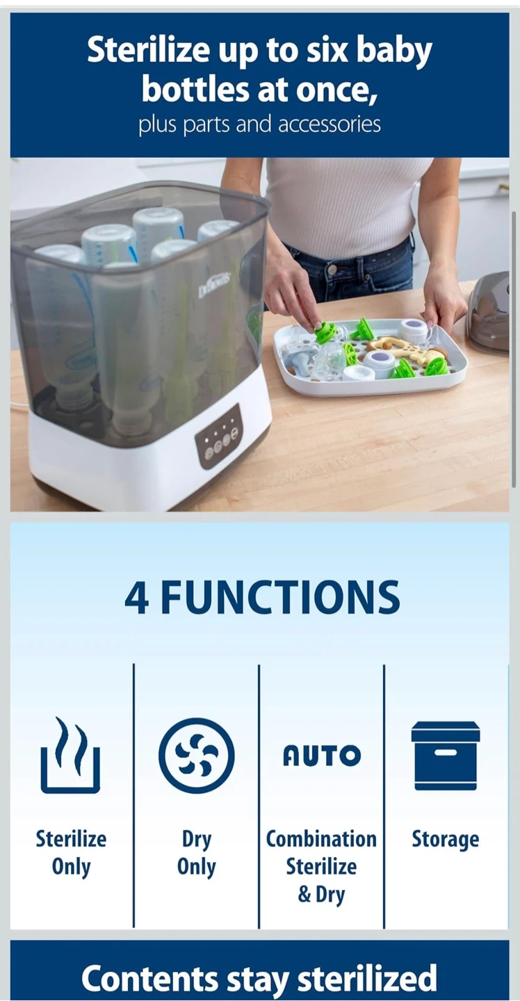 I'm selling a Dr. Brown's baby bottle sterilizer and dryer! It sterilizes up to six baby bottles at once, plus parts and accessories. It has 4 functions: sterilize only, dry only, combination sterilize & dry, and storage. Contents stay sterilized up to 24 hours after cycle has ended