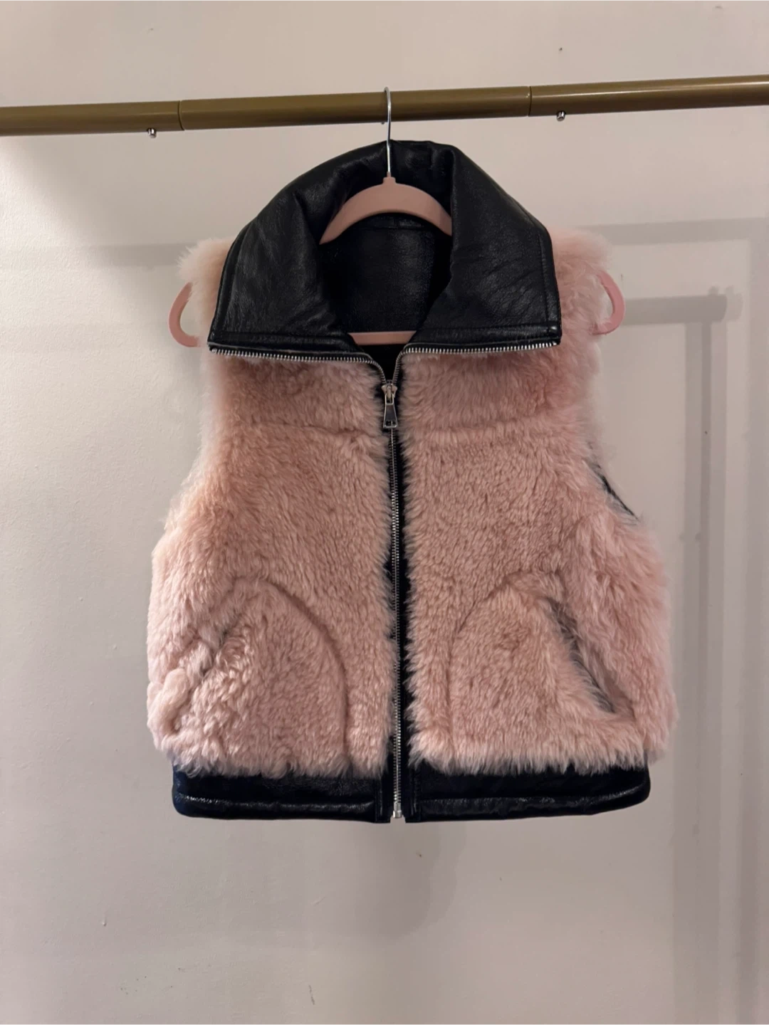 Selling a cute pink faux fur vest! It has a black leather collar and trim. Perfect for layering and adding a touch of style to any outfit