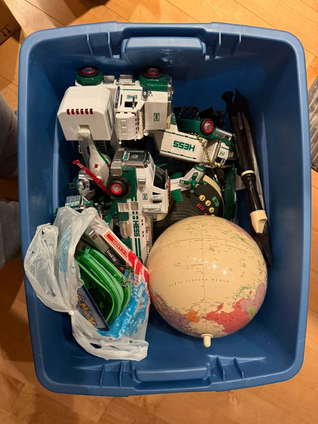 Buy & SellBox of toys, play cards and entertainmentBox of toys, play cards and entertainment$30Selling a collection of Hess toy trucks and a globe! They've been stored in a bin and are ready for a new home1 chats·1 favorites·10 viewsSELLERAlexRidgewood110 reviewsWHERE TO MEETCheck Location