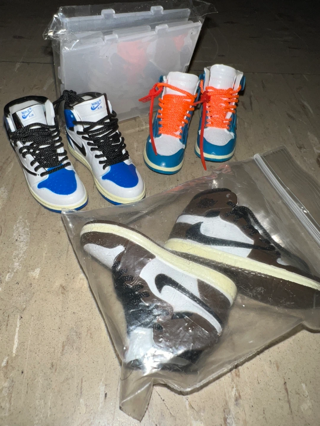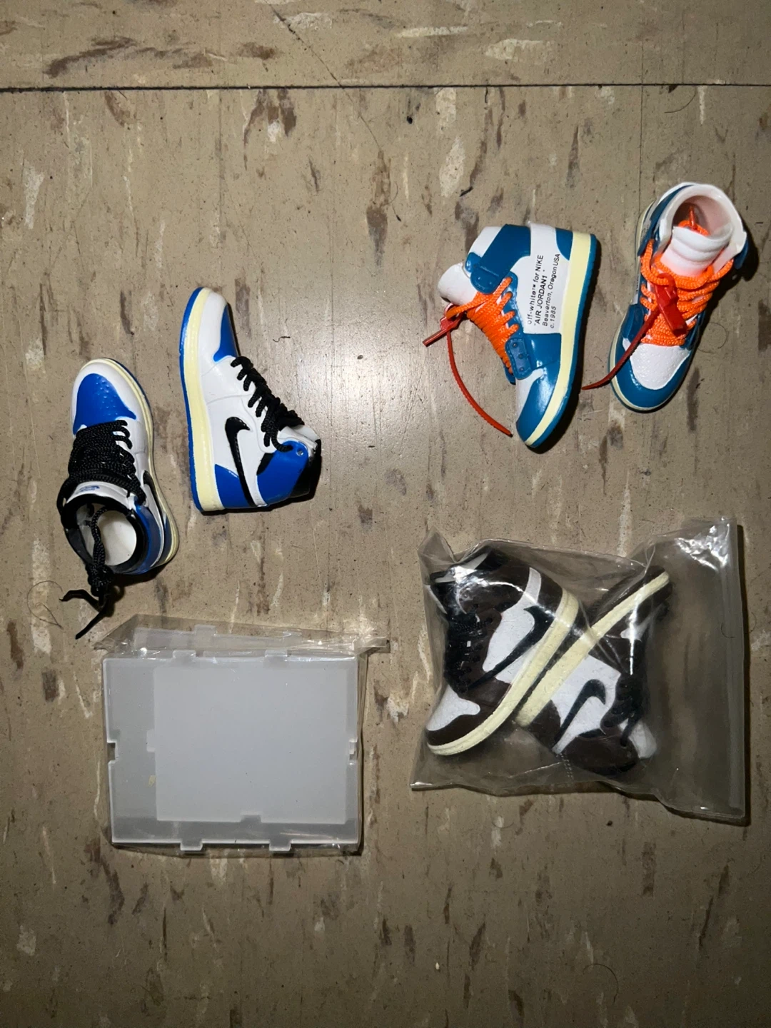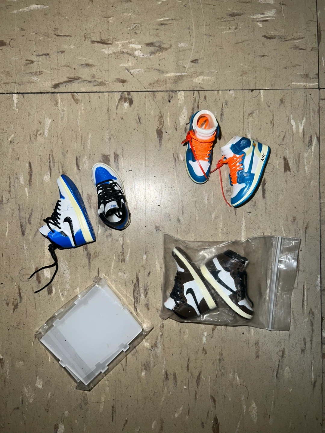 3 pairs of mini sneakers w a new clear mini shoe box. It can be left matte or peeled to be clear. Sneakers can be used as a keychain but there’s no hoop or hook for it