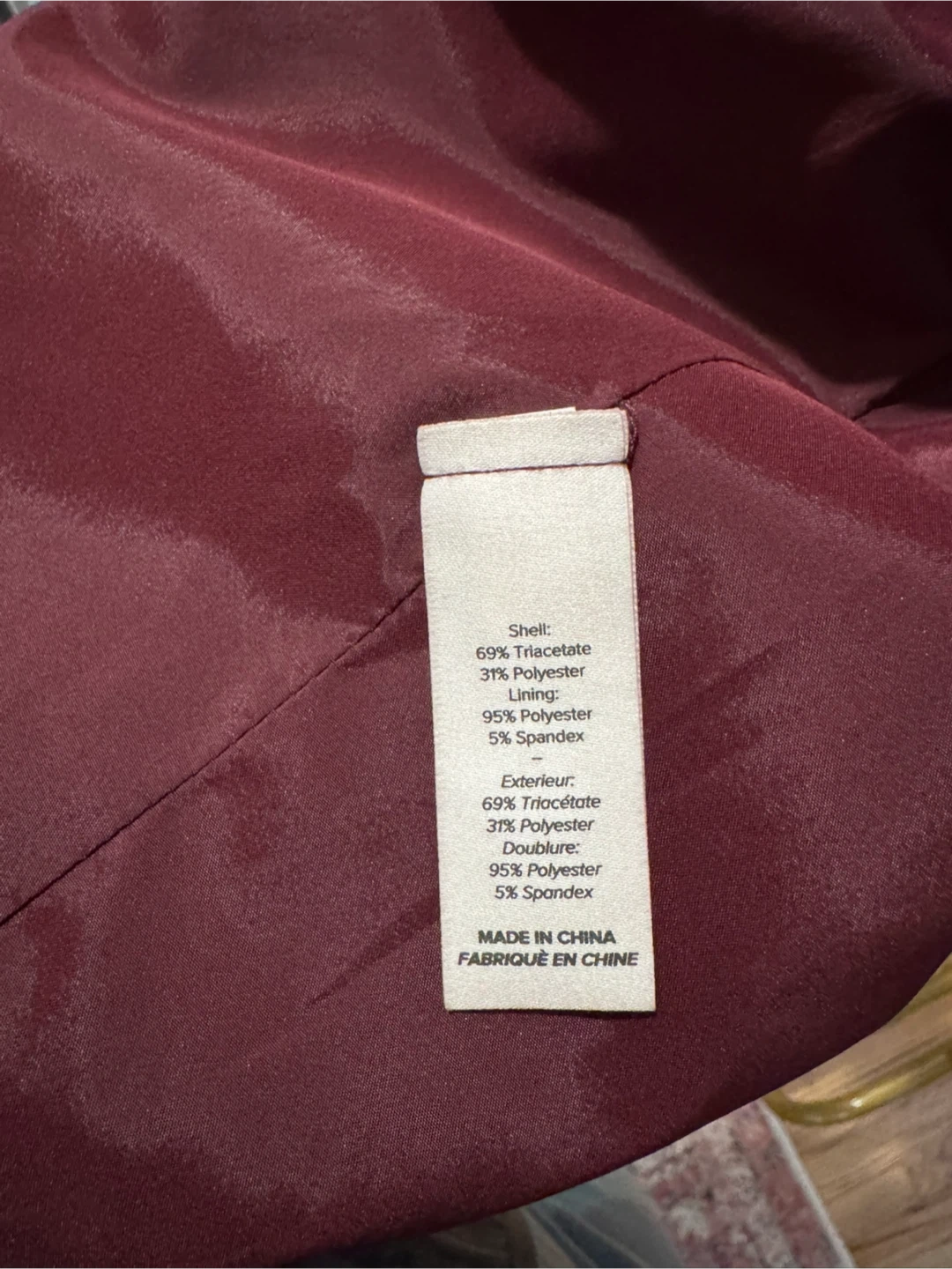 Selling a Cinq a Sept Cheyenne blazer in size 10. It's a beautiful burgundy color and features unique embellishments. The shell is made of 69% Triacetate and 31% Polyester, while the lining is 95% Polyester and 5% Spandex