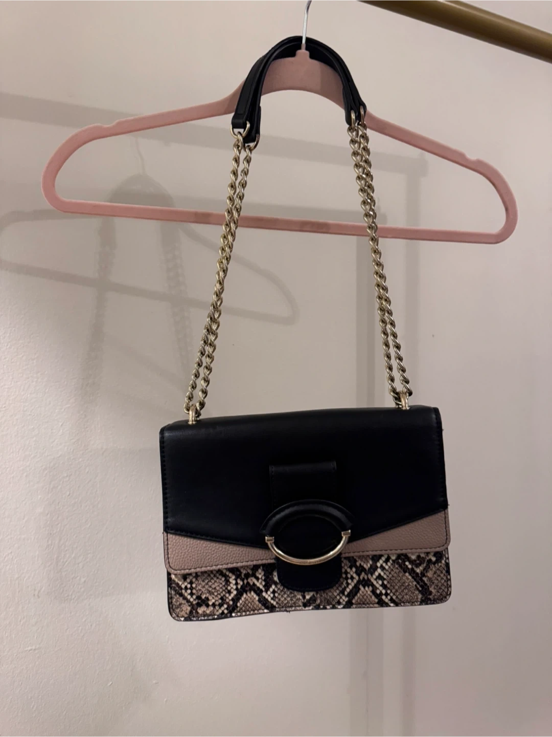 Stylish crossbody bag featuring a snakeskin pattern and a gold chain strap! It's in great condition and ready for a new owner