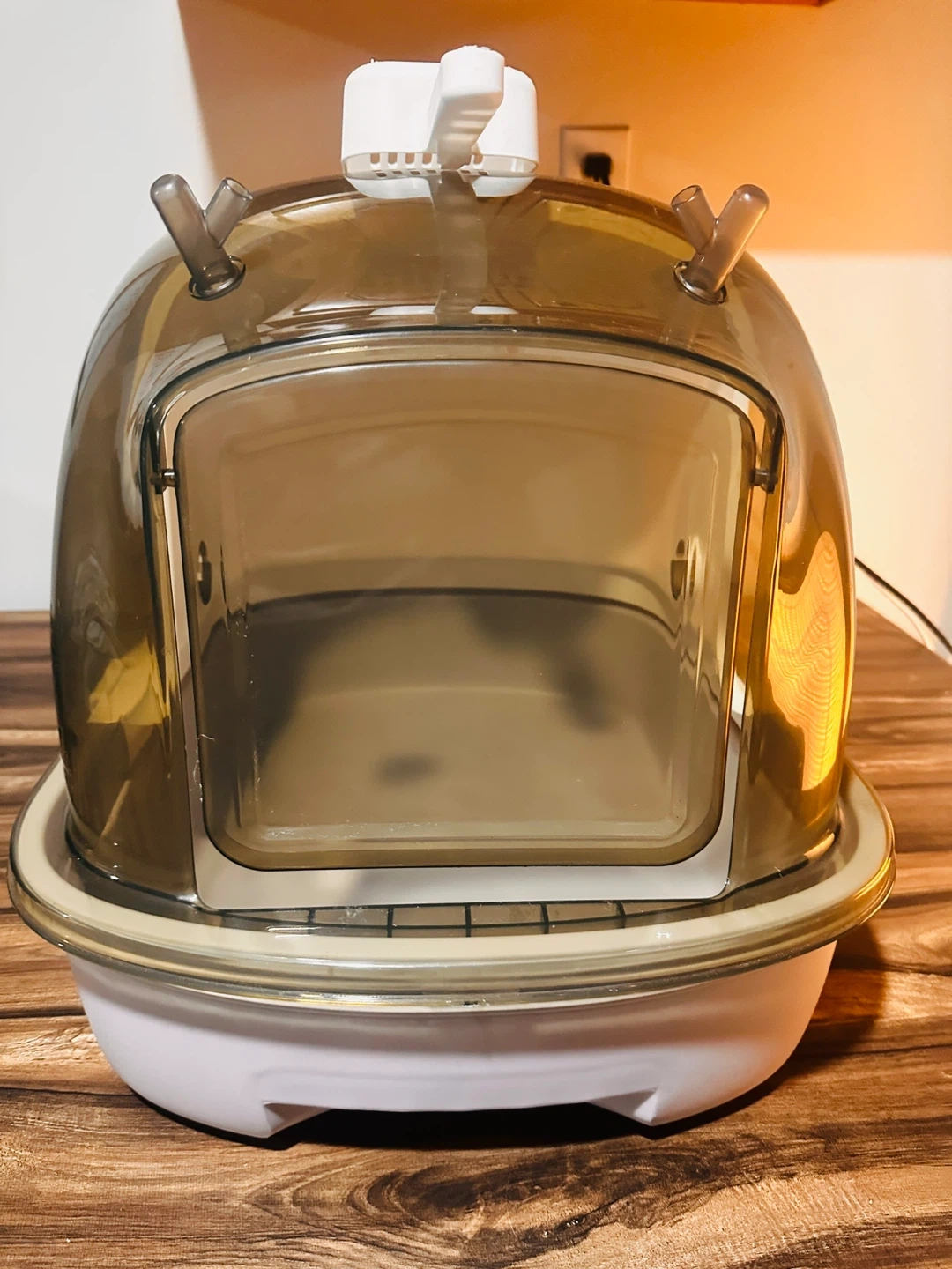 Here's a hooded cat litter box that comes with a scoop! It's in great condition and ready for a new home. Perfect for keeping things tidy and discreet for your furry friend, used 2xs.