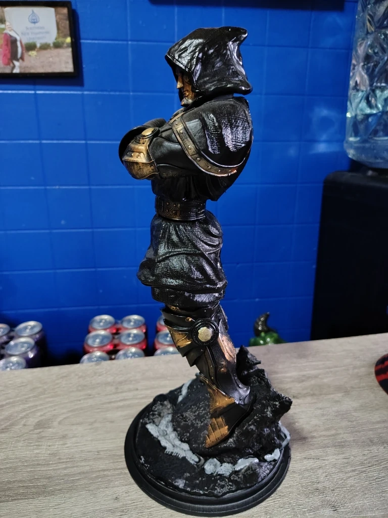 Selling a cool statue featuring a hooded figure in black and gold armor! It's in great shape and would look awesome on a desk or shelf