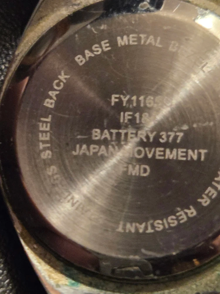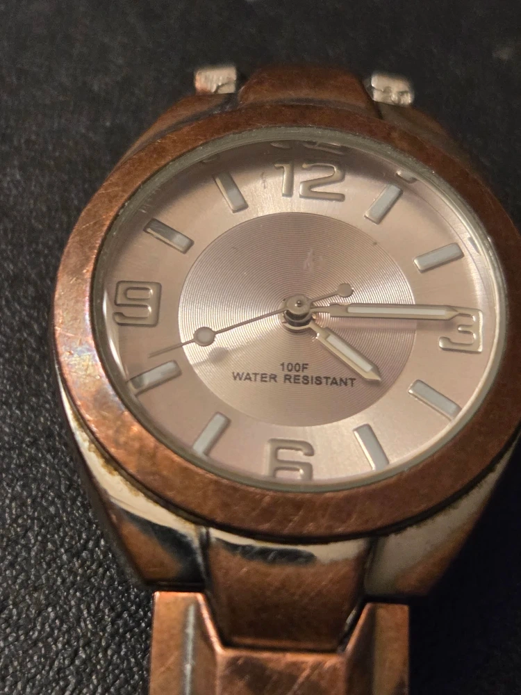 Selling a ladies' fashion watch with a copper-tone finish. It's water-resistant up to 100F and has a base metal bezel with a stainless steel back. The watch features a Japan movement and uses a 377 battery. It shows some signs of wear but is still in good working condition