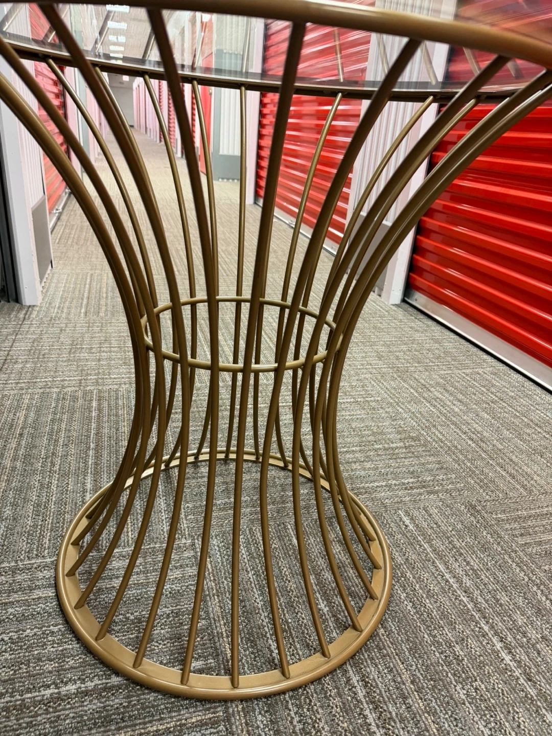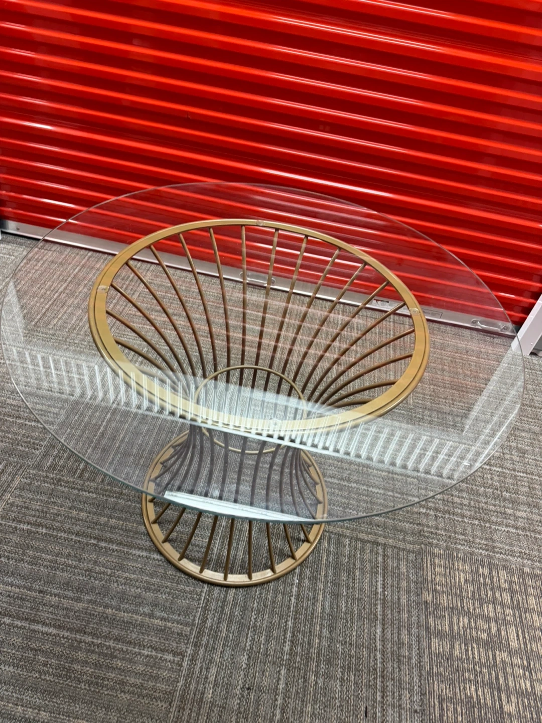 Selling a stylish glass top round dinning table. It features a unique metal base with a gold finish. The table is in good condition like new and would make a great addition to any living room! Fits 4-5 chairs.
