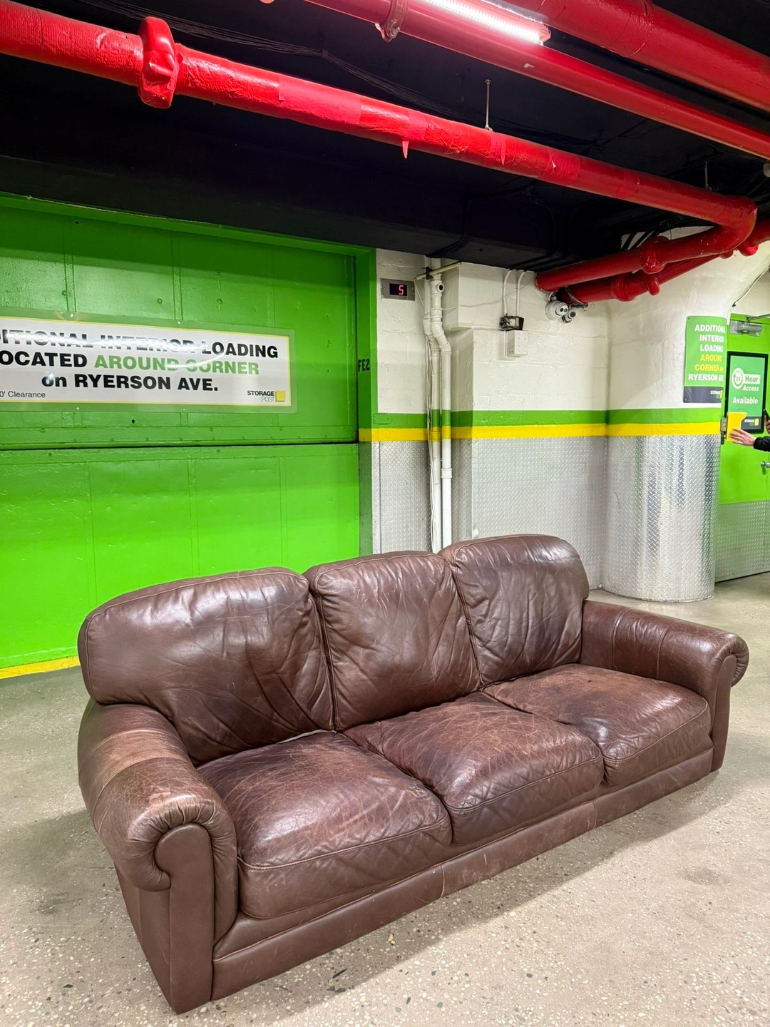 This is a beautiful, classic 3-seater brown leather sofa with elegant rolled arms. The durable, distressed leather has developed a rich, vintage patina over time, showcasing natural wear, scuffing, and wrinkling that adds character and a lived-in feel.