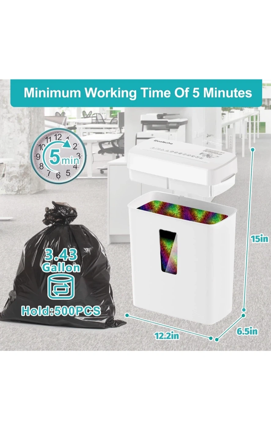 【5-sheet Micro Cut】The Micro cut Paper shredder shred Max 5-sheet(at a time), no need to remove staples or clips.