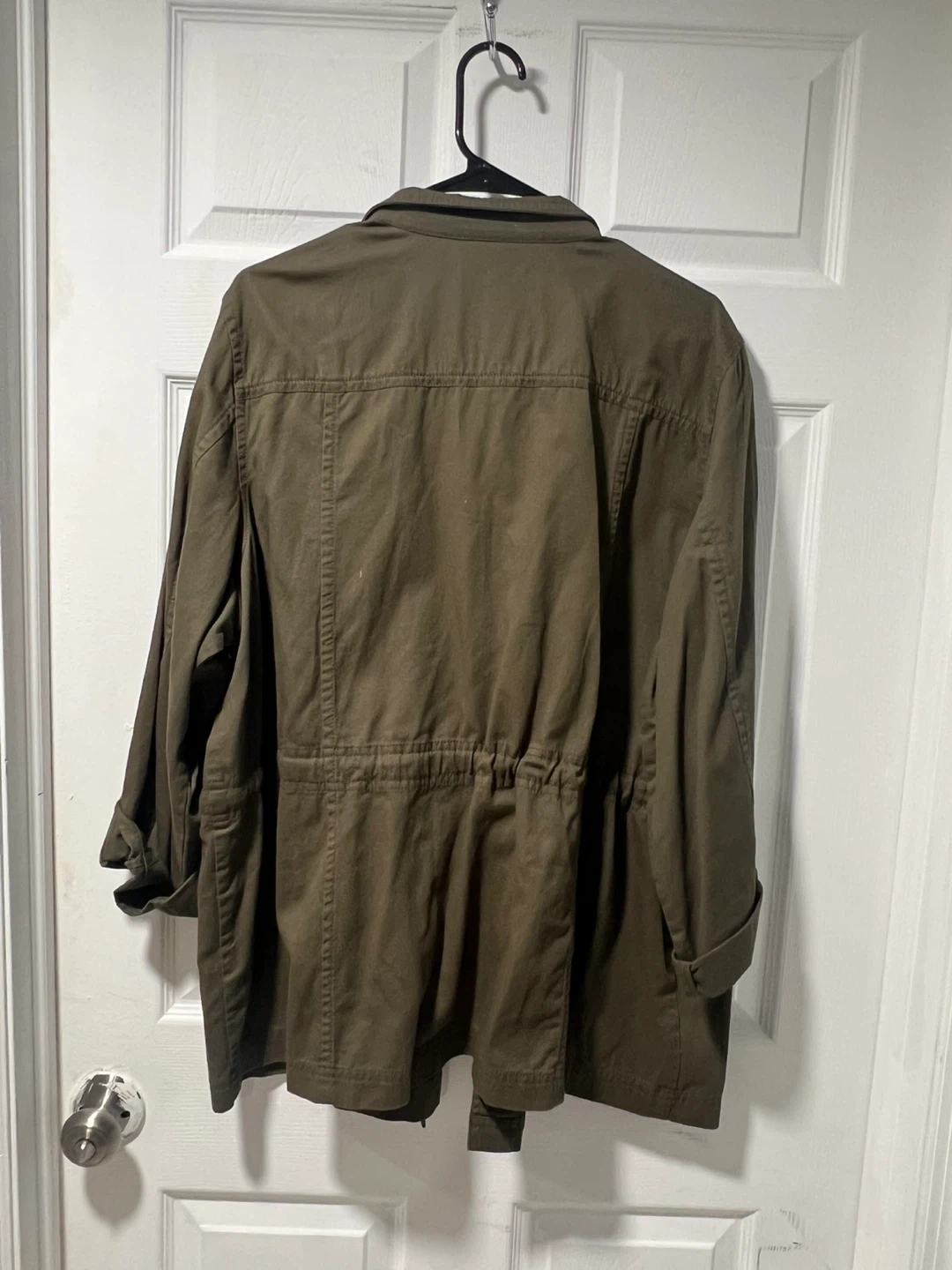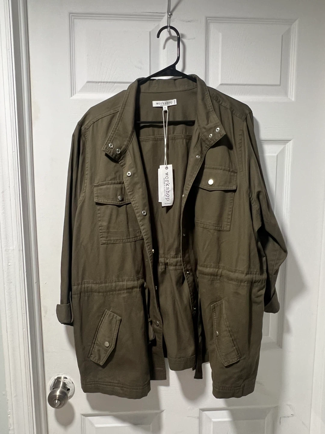 This is a Workshop brand jacket in olive green. It's a stylish and versatile piece that would be a great addition to any wardrobe. It features a drawstring waist for a customizable fit and multiple pockets for convenience