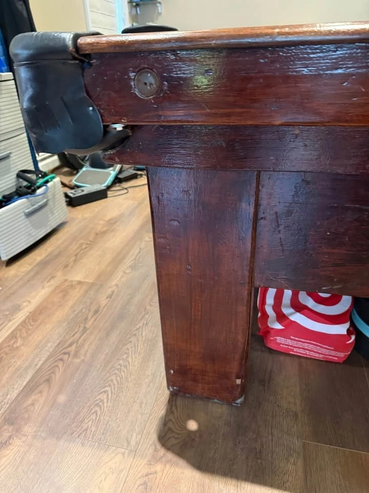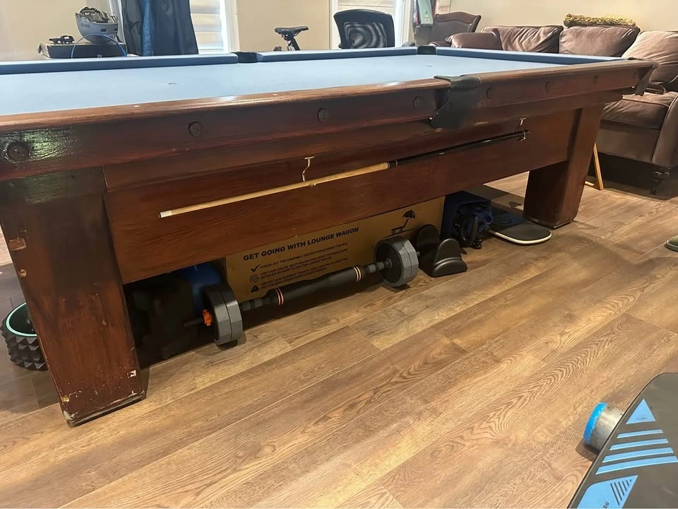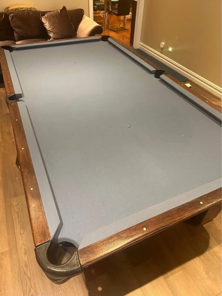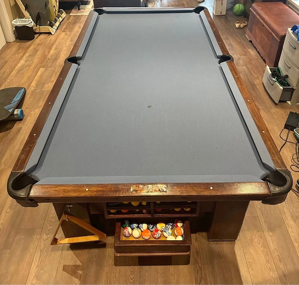 This is a 9’ slate (3) antique pool table in great condition, though the wood could use some touch ups if you want it to be absolutely pristine. The felt and bumpers were just replaced in 2024. The ball return works perfectly. Not kept in a basement, so really not showing any wear since I got it. I installed hooks for the cues and the triangle. We will include one set of balls and the triangle. We can also include the tie-dye balls and the training cue ball for $60. We also have two premium cues with cases that we would be willing to include for $50 each. For $1,500 even, we’ll include all accessories and equipment that we have (also includes some chalk, cue stands, brushes, cue cleaner, table cover).