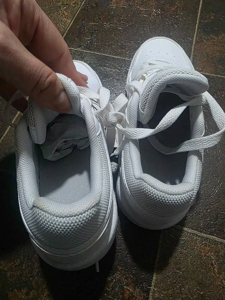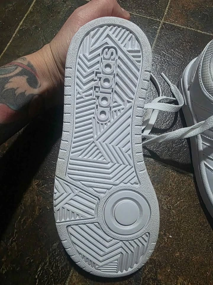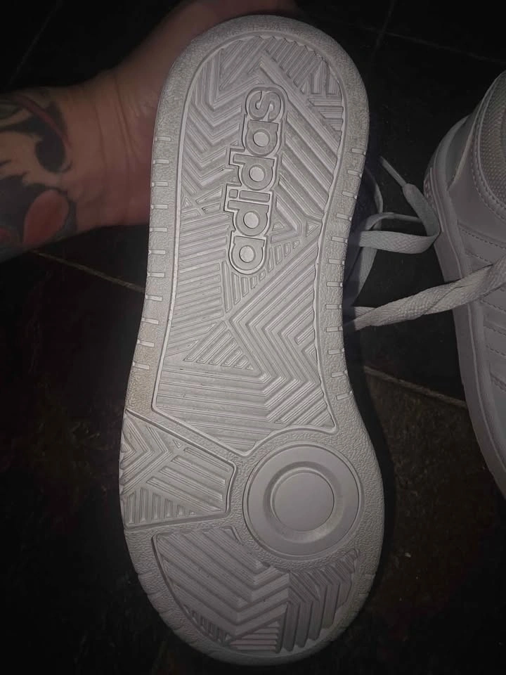 Adidas Hoops 3.0 K, white sneakers, youth size 1. Brand new, no box. The shoelaces are dirty, check the photos carefully. My son just tried them on once to walk in the house for about 20 min.