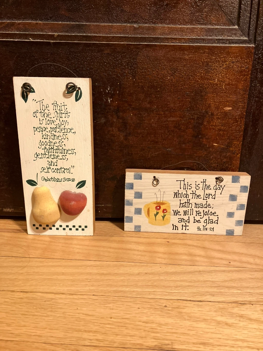 Price for both! I'm selling two handmade wooden decorative signs. One sign has the quote "The fruit of the Spirit is love, joy, peace, patience, kindness, goodness, faithfulness, gentleness, and self control." Galatians 5:22-23. The other sign has the quote "This is the day which the Lord hath made; we will rejoice and be glad in it." Ps. 118:24