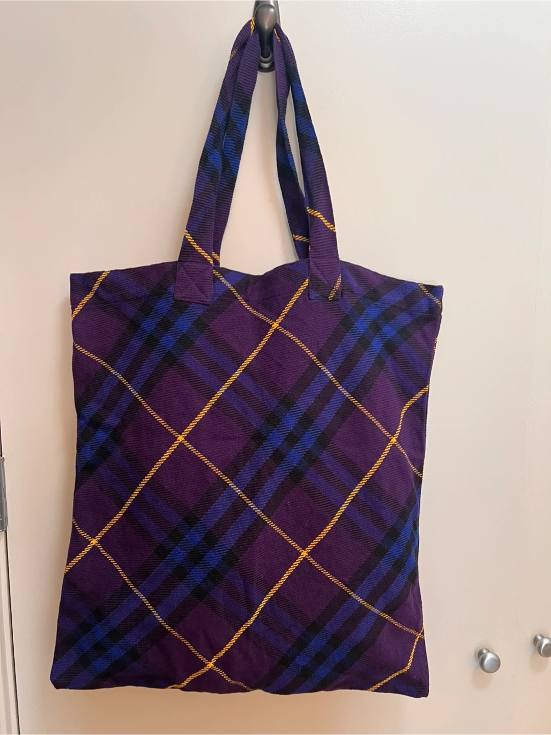 Burberry purple plaid tote bag in great condition and ready for a new home. The handles measure approximately 11 inches, and the bag itself is about 22 inches tall