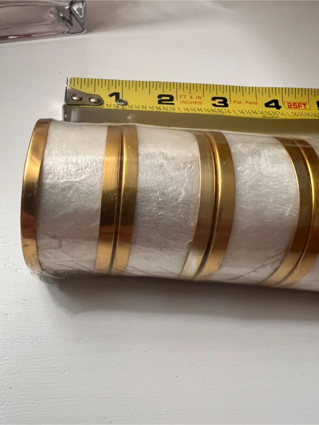 Selling a set of 6 napkin rings, still in their original packaging! They feature a beautiful gold and white design that would add a touch of elegance to any table setting. Each ring measures approximately 1 inch in diameter.