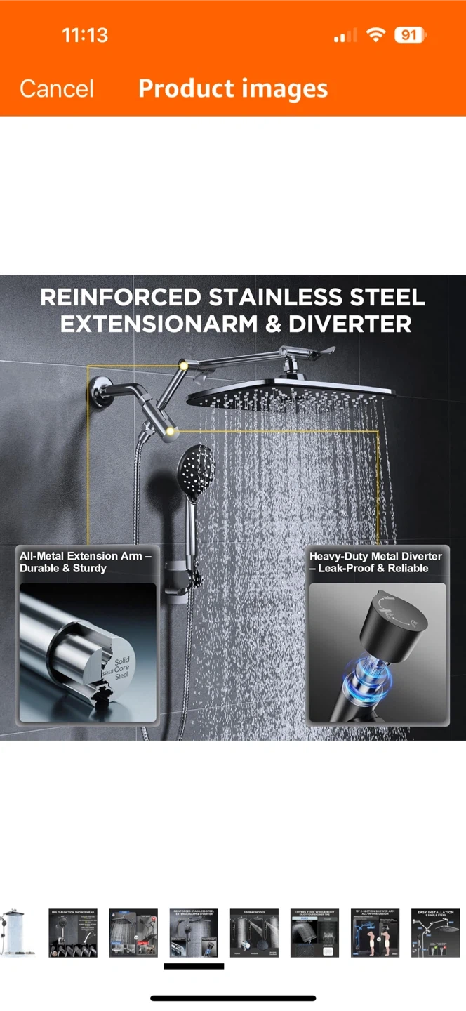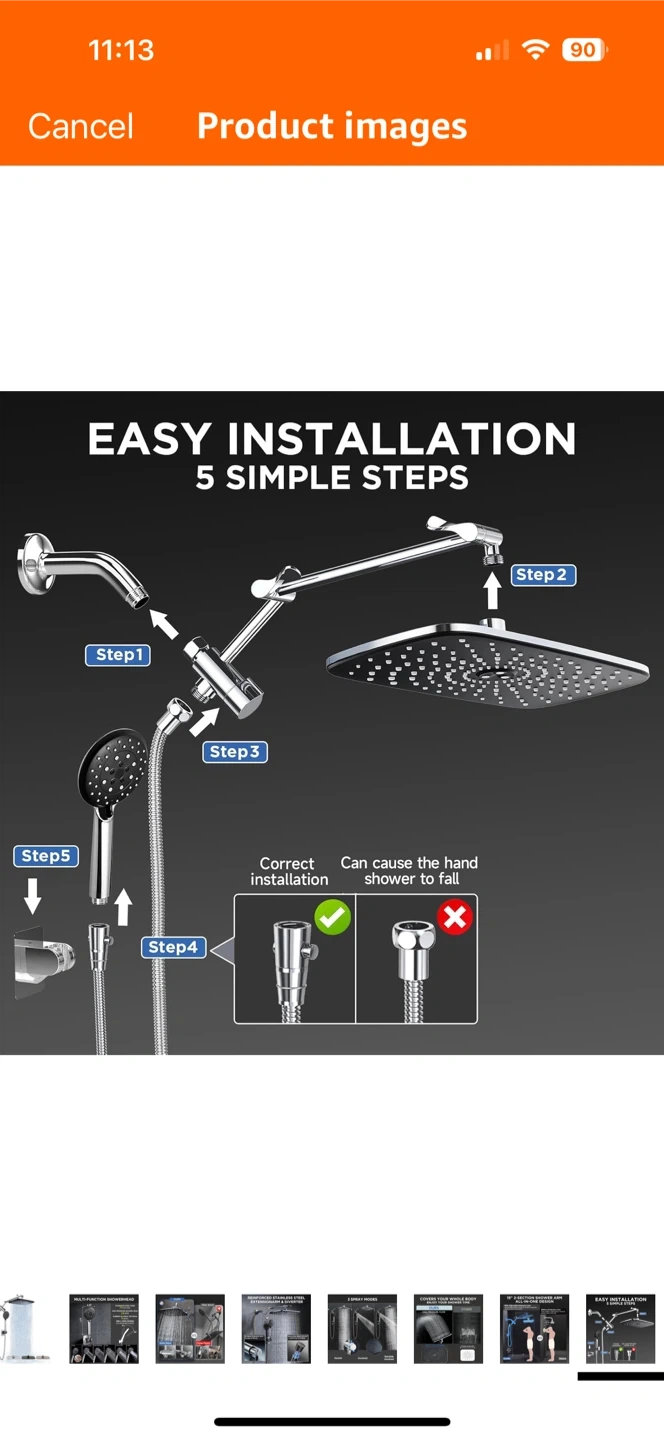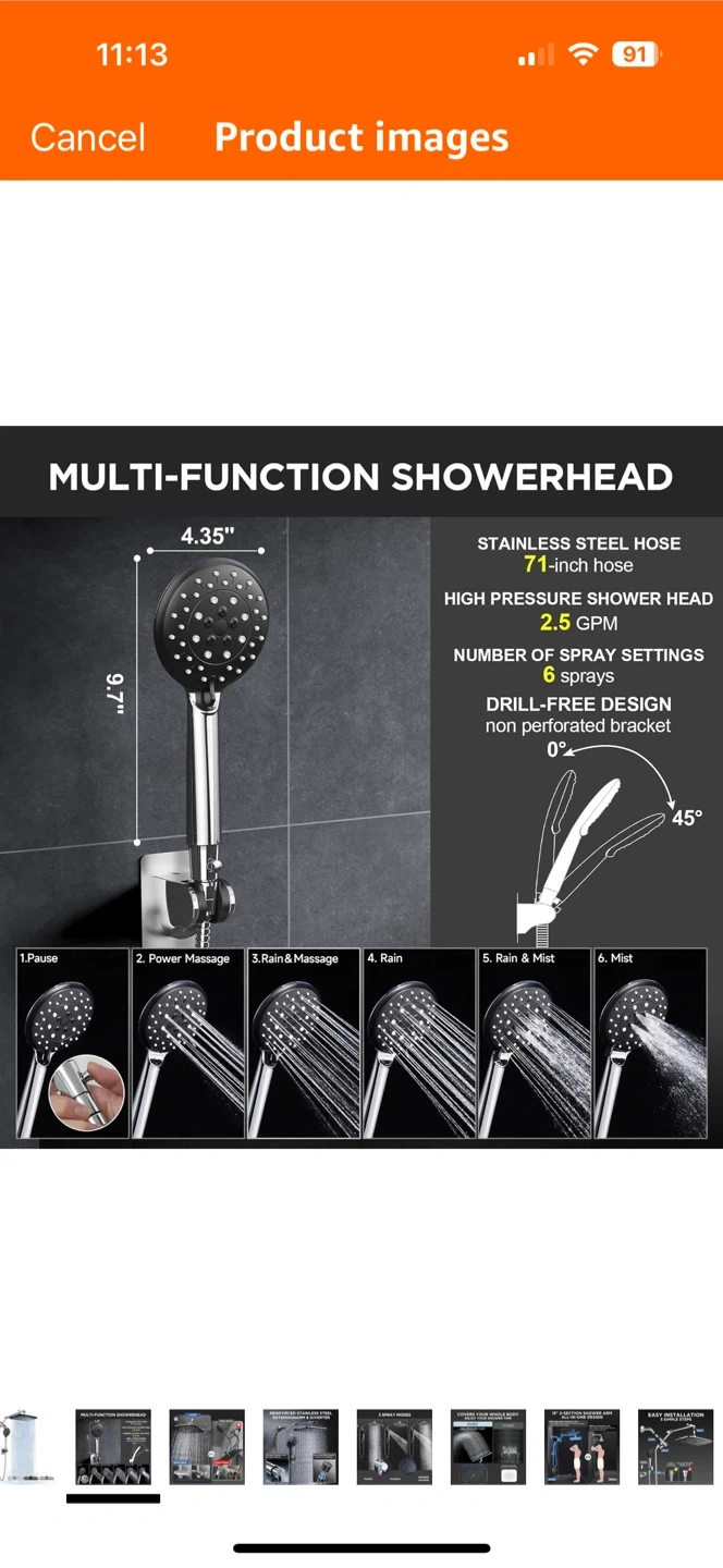 This multi-function showerhead has 6 spray settings to cover your whole body and enjoy your shower time! The stainless steel hose is 71 inches long, and the high-pressure shower head is 2.5 GPM. It also has a drill-free design.
