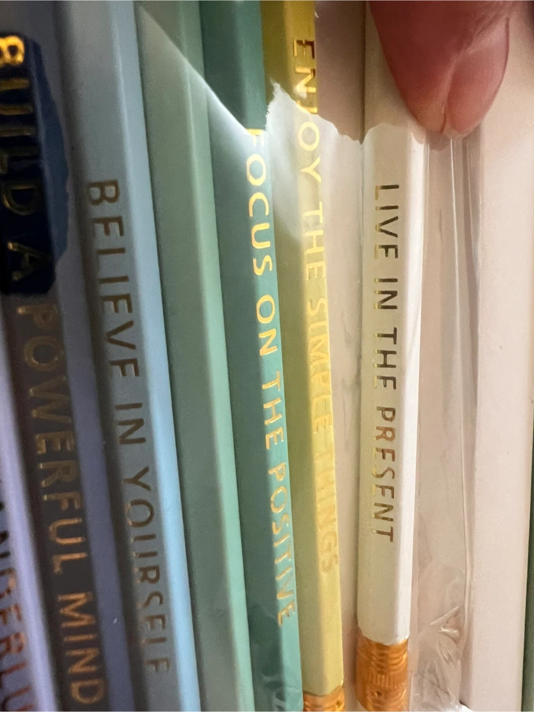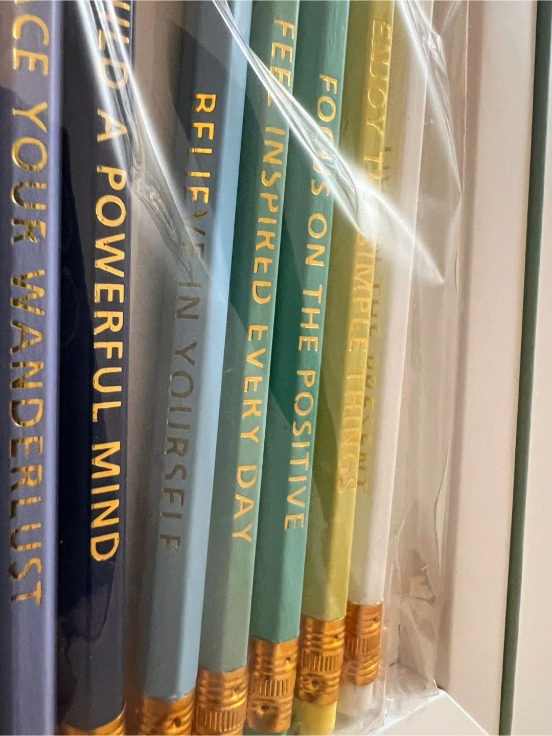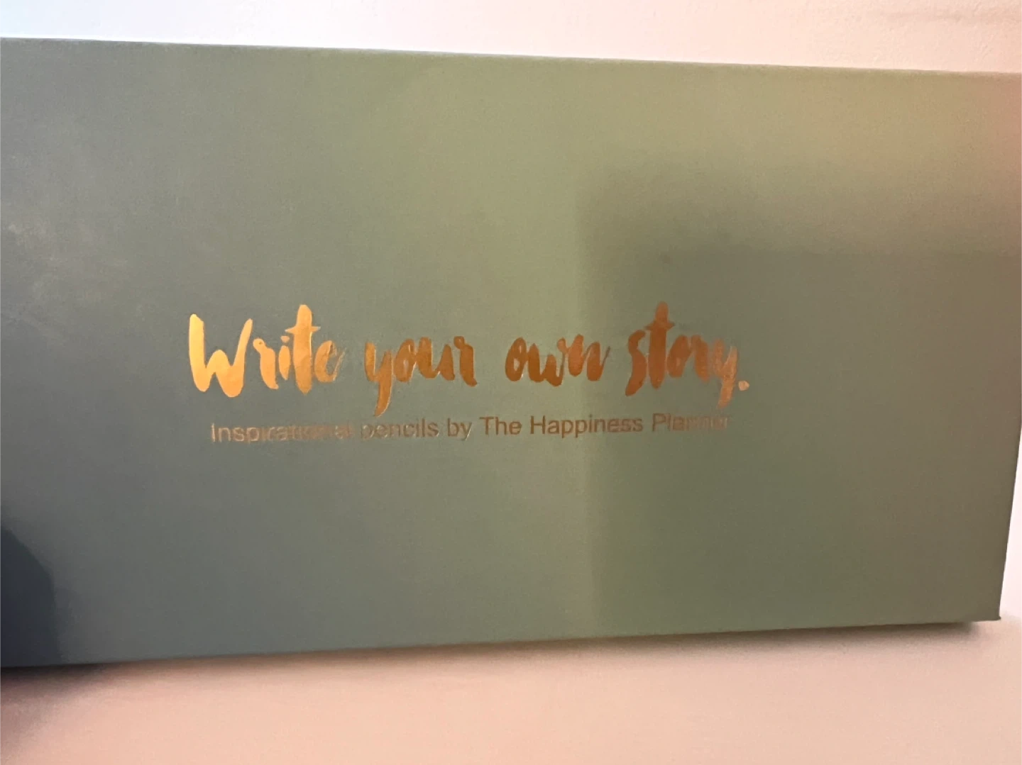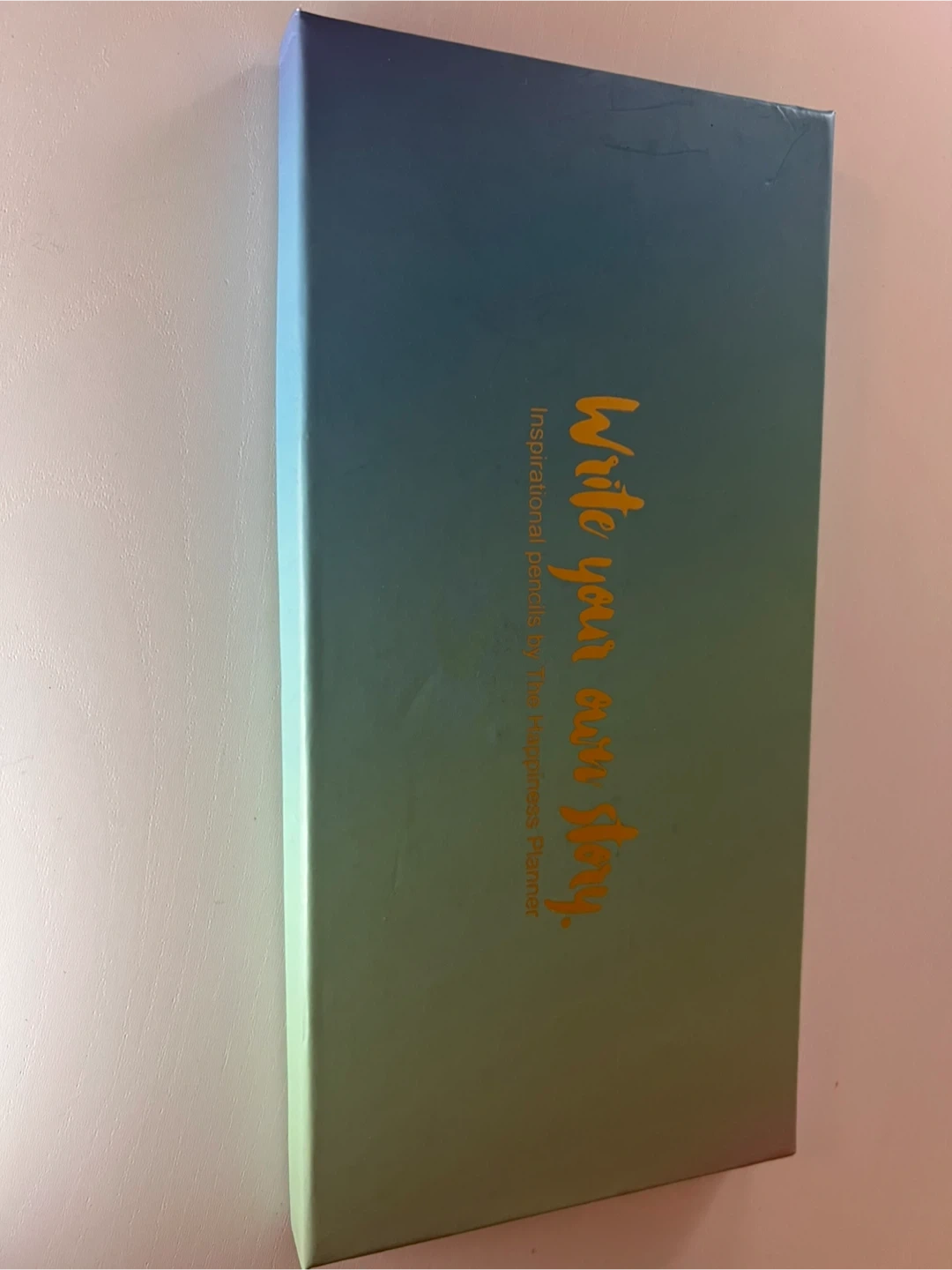 Write Your Own Story Inspirational Pencils by The Happiness Planner. This set of pencils comes in a box and includes a sharpener. Each pencil has an inspirational phrase on it. They are still in their original packaging