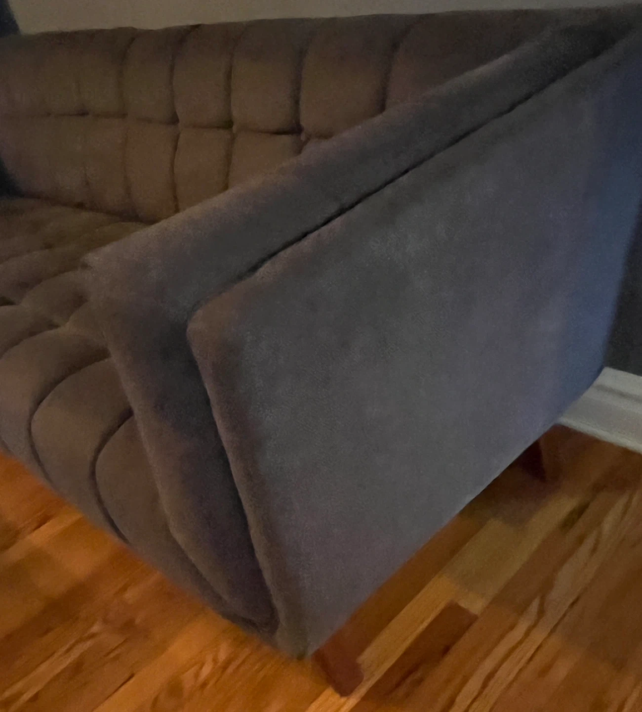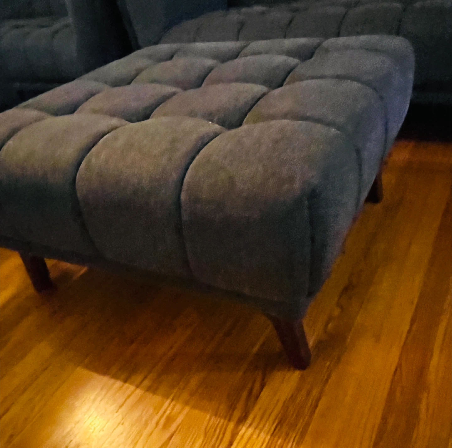 Selling a comfortable gray sectional sofa that comes with a matching ottoman. It's in good condition and would be a great addition to any living room. The sofa has a stylish, tufted design and is perfect for lounging or entertaining guests. Feel free to reach out if you have any questions!