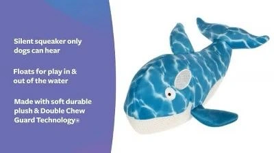The adorable, friendly orca is made with Chew Guard Technology® and Double Chew Guard Technology® to stand up to tough play, guaranteed. Double Chew Guard Technology® helps the orca float and dry quickly for playtime in and out of the water. This silent orca features TrustyPup® Silent Squeakers™. Tuned to an ultrasonic frequency between 24 and 28 KHz, it is outside a human's hearing range but within a dog's. All humans hear is a puff of air, but dogs hear a traditional squeaker toy. Your dog can enjoy a wildly fun, squeaky toy without disturbing you or your guests.